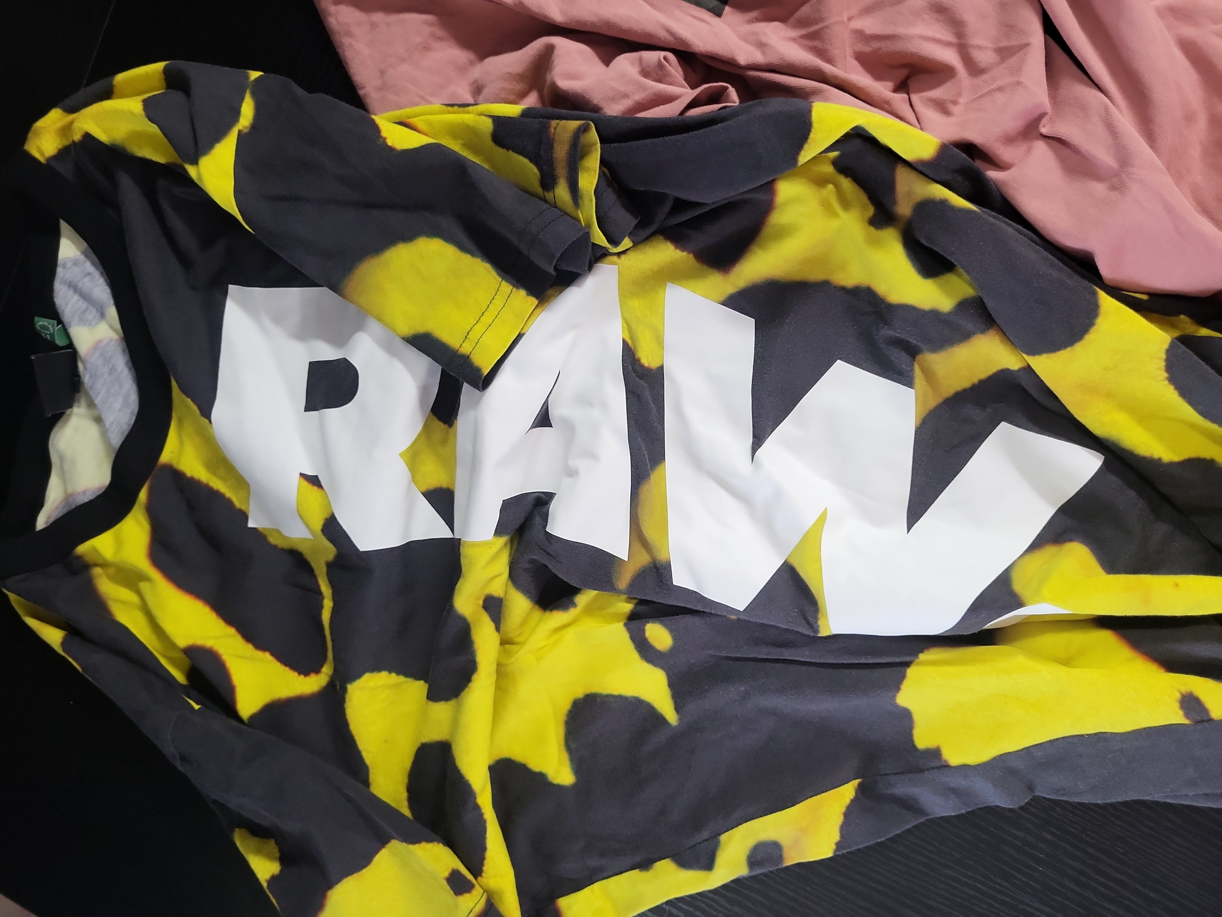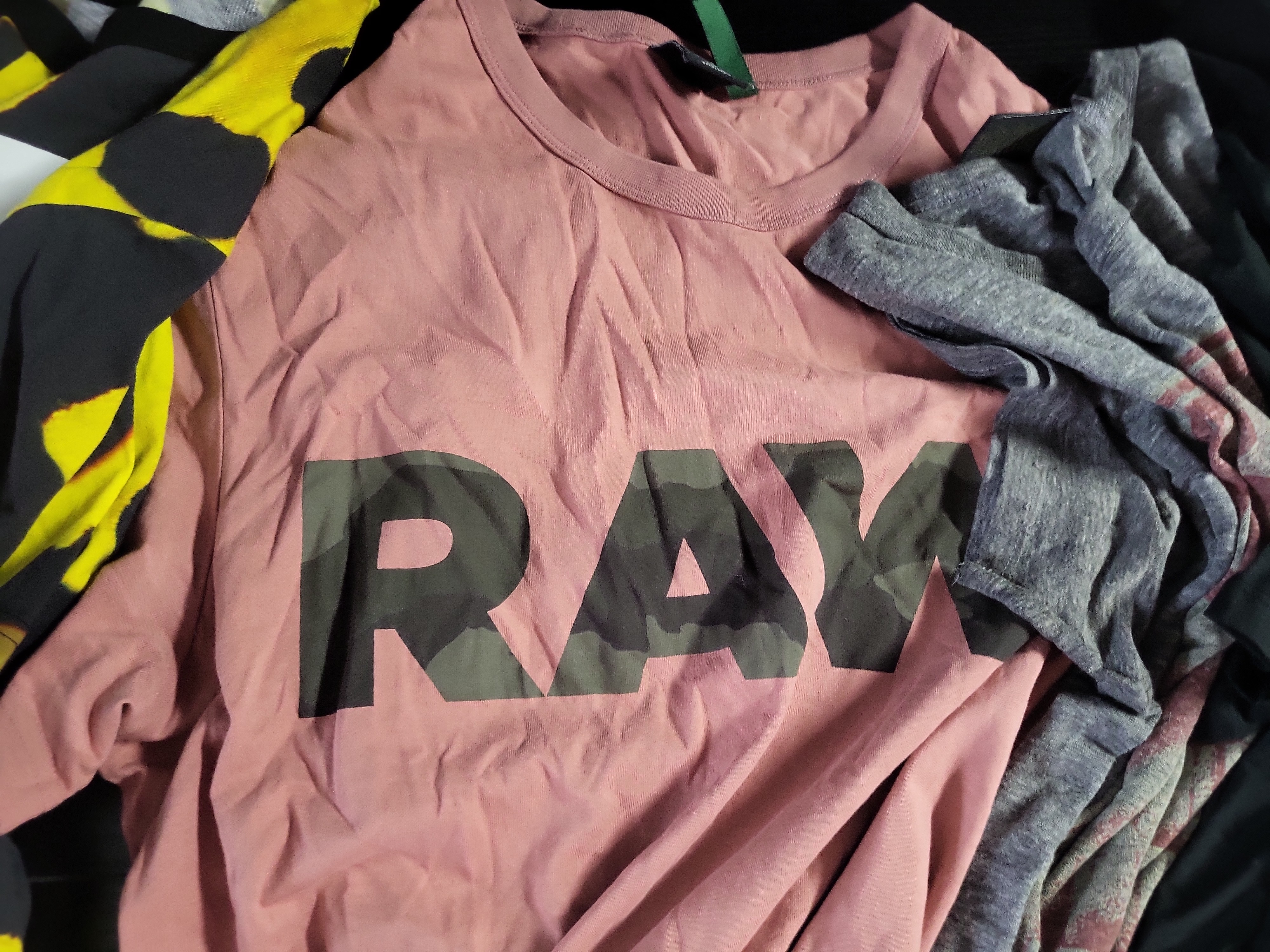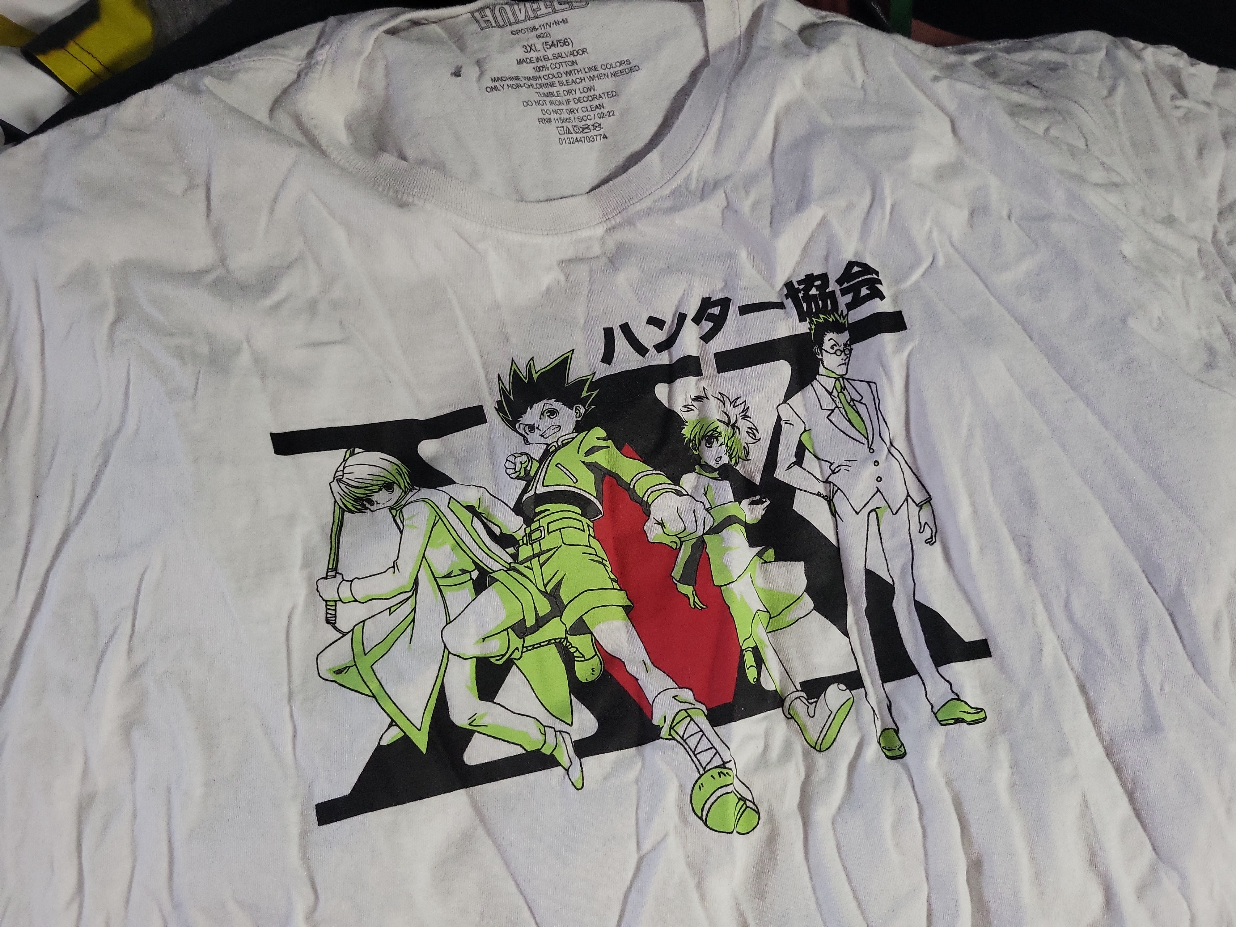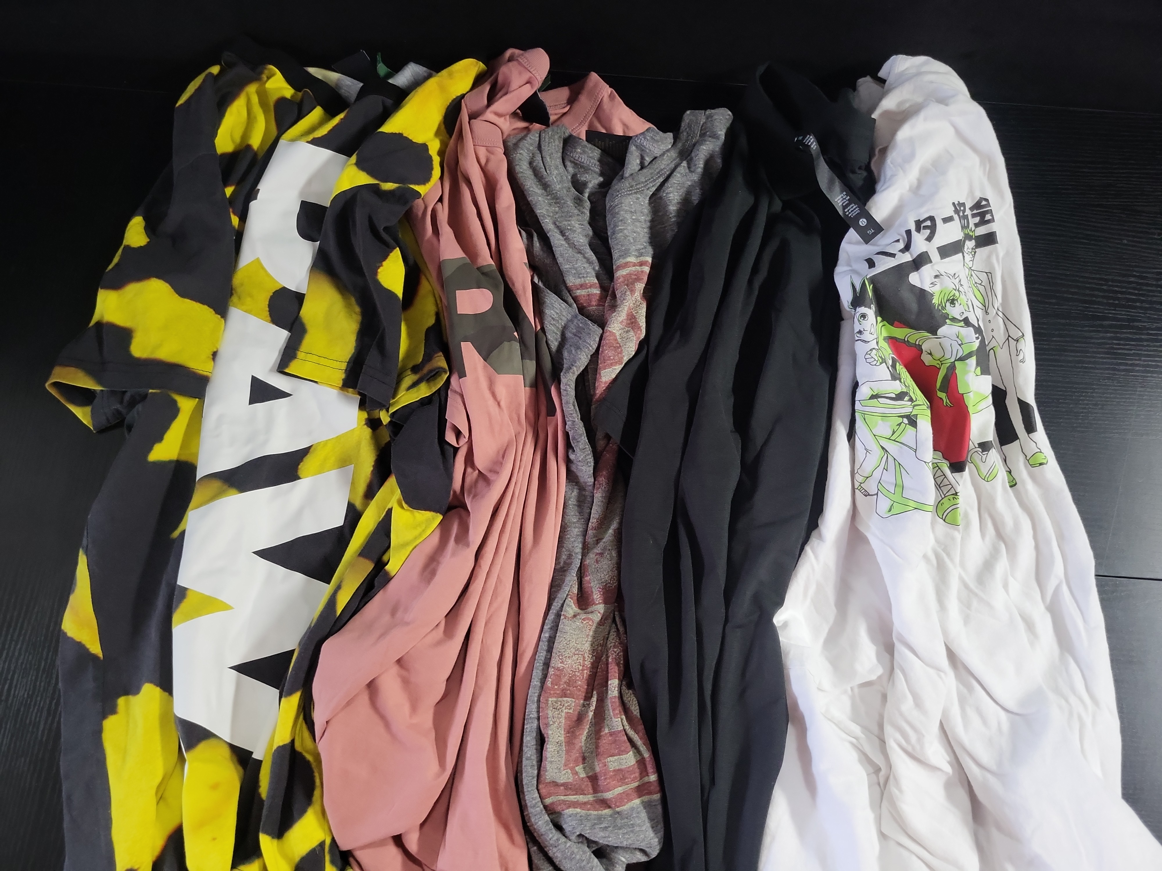 This lot consists of five modern short-sleeve crew-neck t-shirts dating from approximately the 2010s through 2022. The collection includes designer and licensed apparel. Two shirts are from G-Star RAW: one featuring a vibrant yellow and black abstract camouflage pattern with white block lettering, and the other in a dusty pink hue with camouflage-patterned branding. The lot also contains a grey heathered jersey shirt with a distressed red Diesel graphic. A minimalist black crew-neck shirt is included, retaining its original fabric brand and size tag. The final piece is a white 100% cotton t-shirt featuring licensed Hunter x Hunter anime graphics and Japanese text. This garment was manufactured in El Salvador and is dated 2022. All items feature standard machine-stitched jersey construction with ribbed necklines. Measurements: Hunter x Hunter shirt: Size 3XL (54/56). Other sizes not specified.