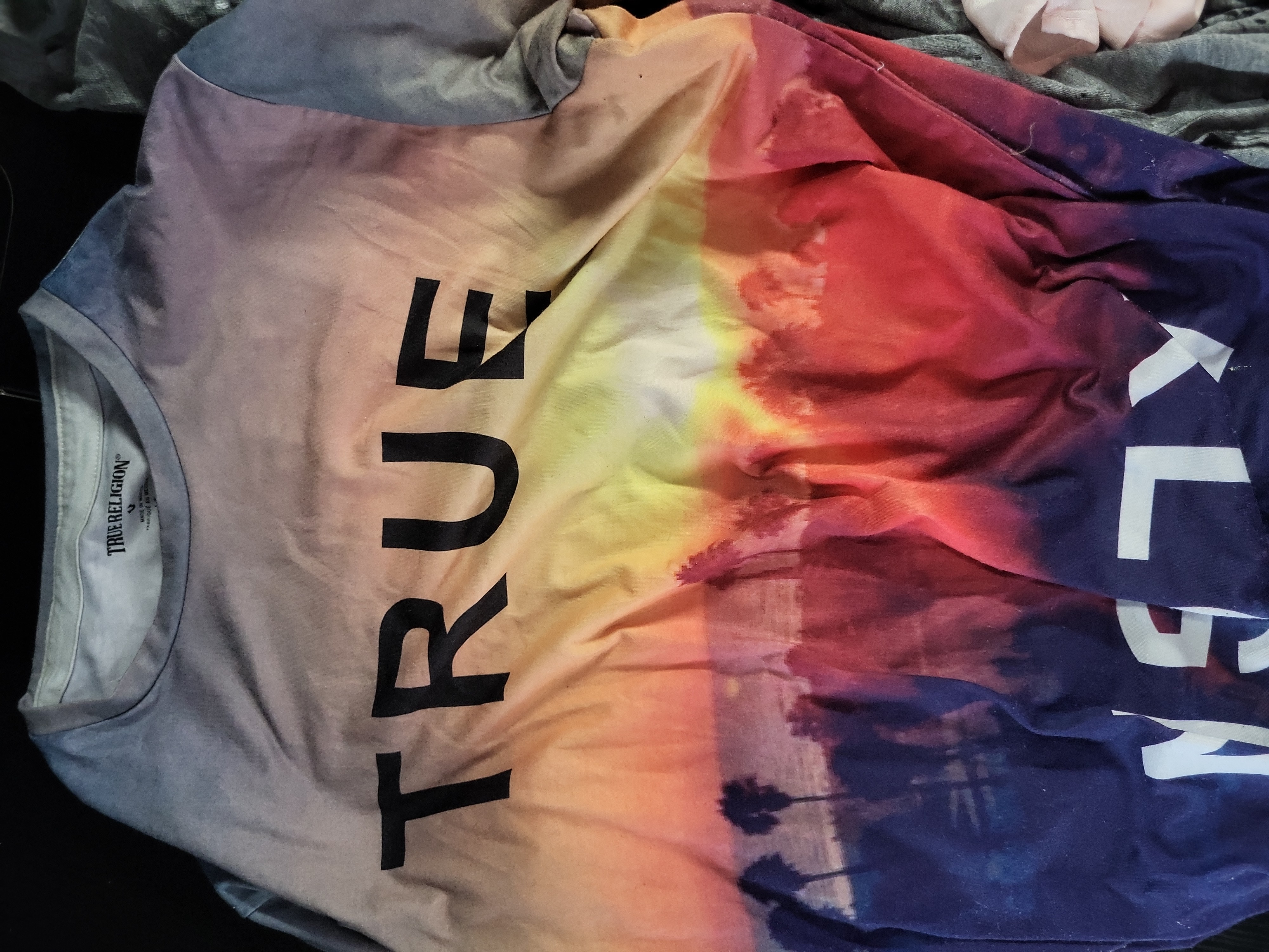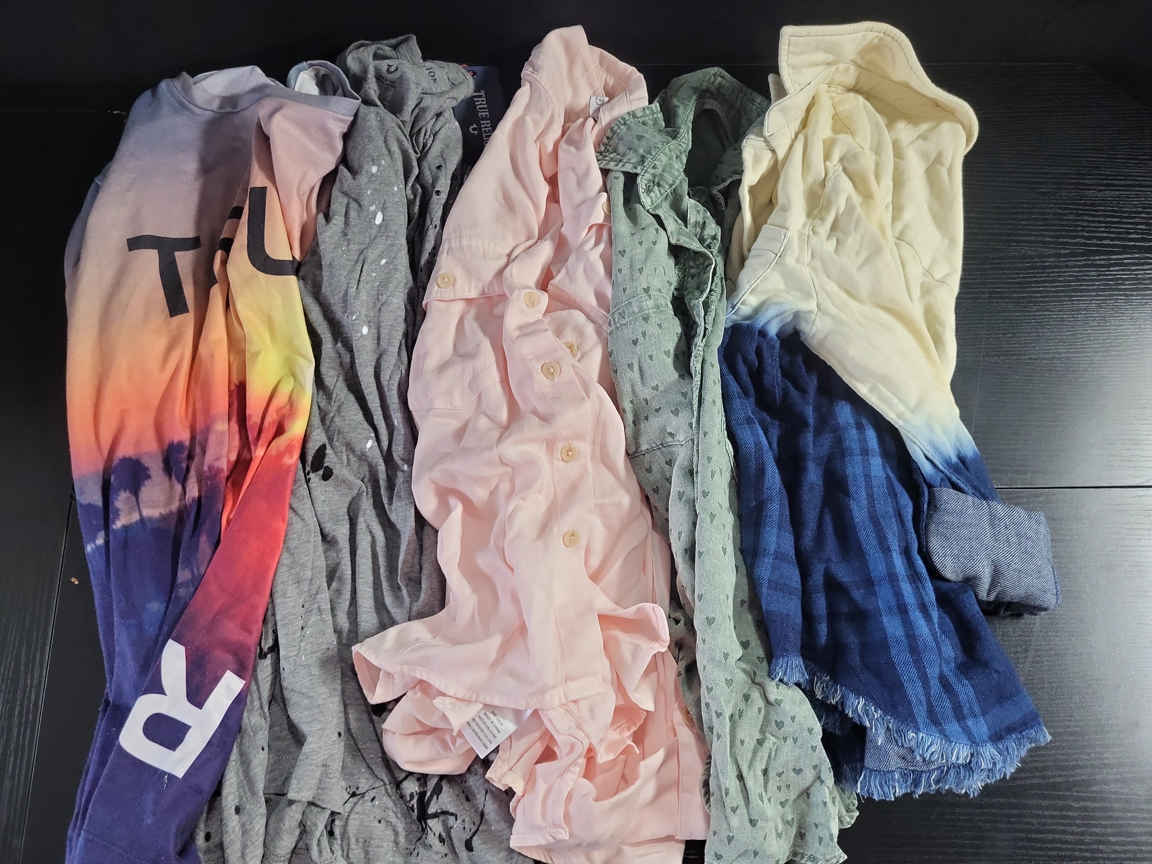 This collection of contemporary designer garments features casual and streetwear-inspired aesthetics from the 21st century. The lot includes two T-shirts by True Religion and three button-front shirts by Billy T. The first True Religion item is a short-sleeved crew-neck T-shirt in a lightweight jersey knit, featuring an allover sublimated photographic sunset print with palm tree silhouettes and bold graphic text; the interior label indicates it was made in Mexico. The second True Religion item is a heather gray V-neck T-shirt with intentional black and white paint-splatter distressing and a printed horseshoe logo at the neck, featuring a red plastic brand seal. The Billy T selection includes a pale pink long-sleeved shirt in a soft-drape woven fabric with a single button-down chest pocket; a sage green chambray shirt featuring an allover heart pattern and a raw-edge hem; and a dip-dyed plaid shirt transitioning from a cream upper to a blue and navy check lower with a frayed hem. All items are identified by brand-specific interior labels. Measurements: Sizes range from Small to Medium.