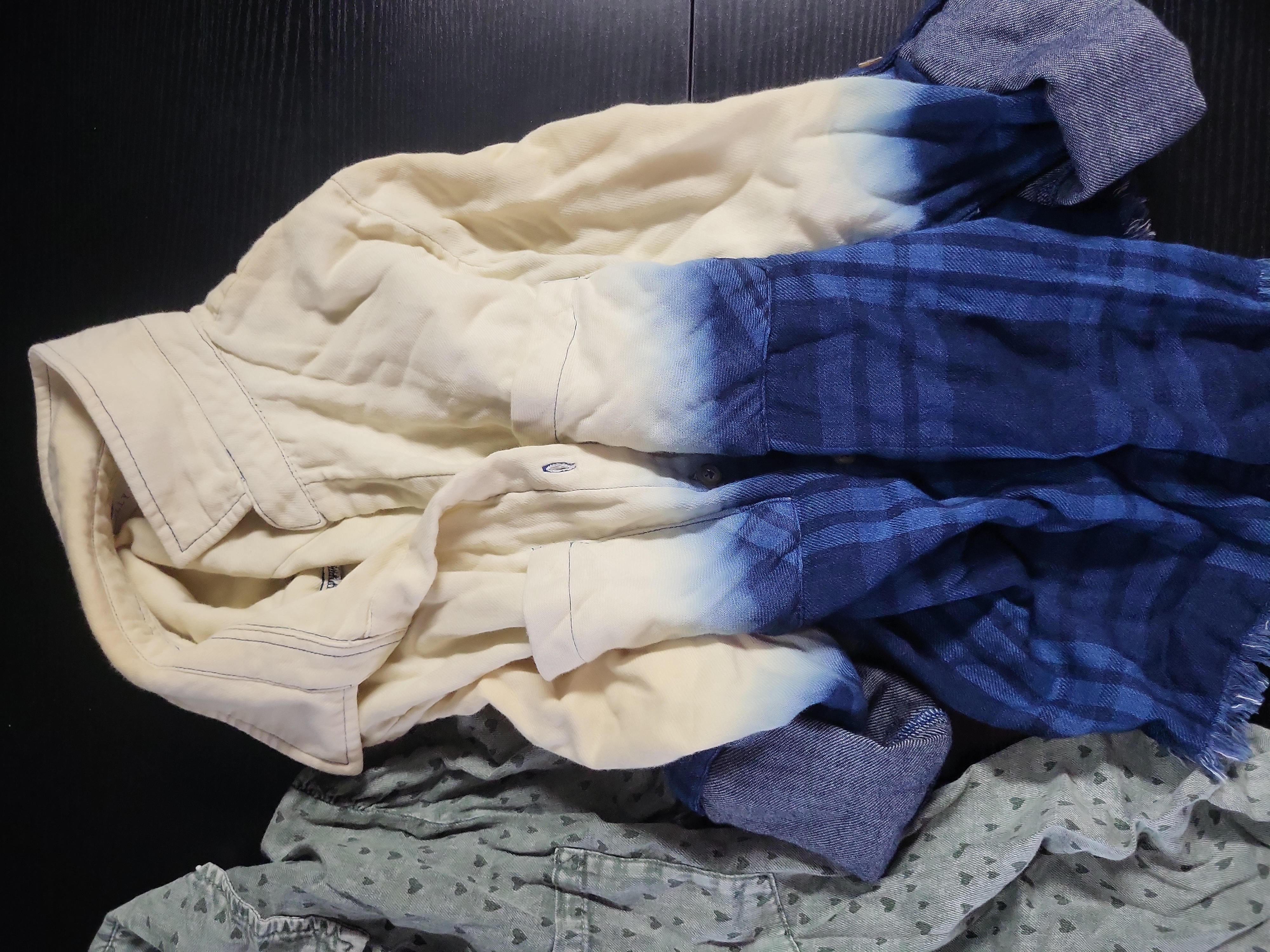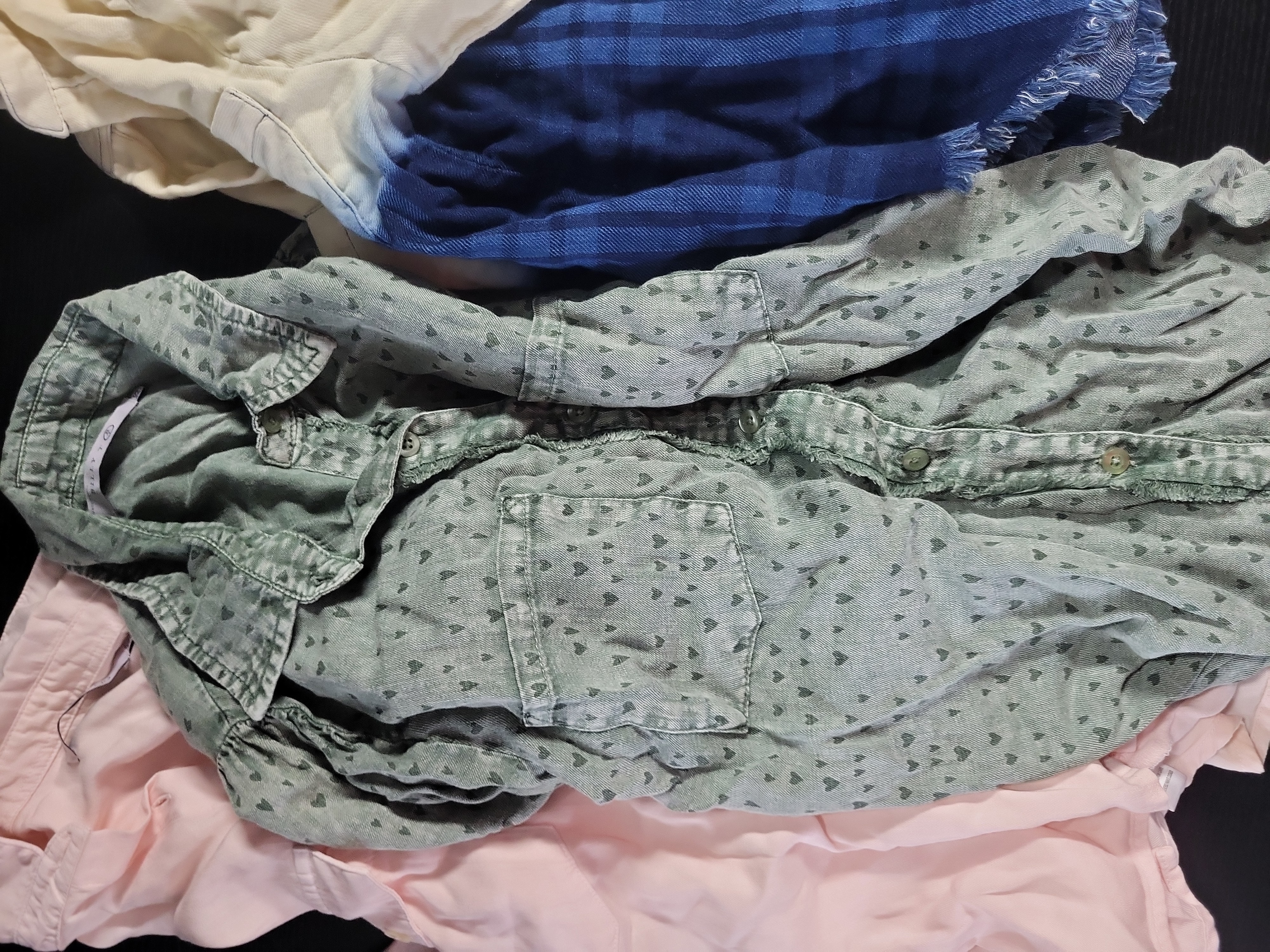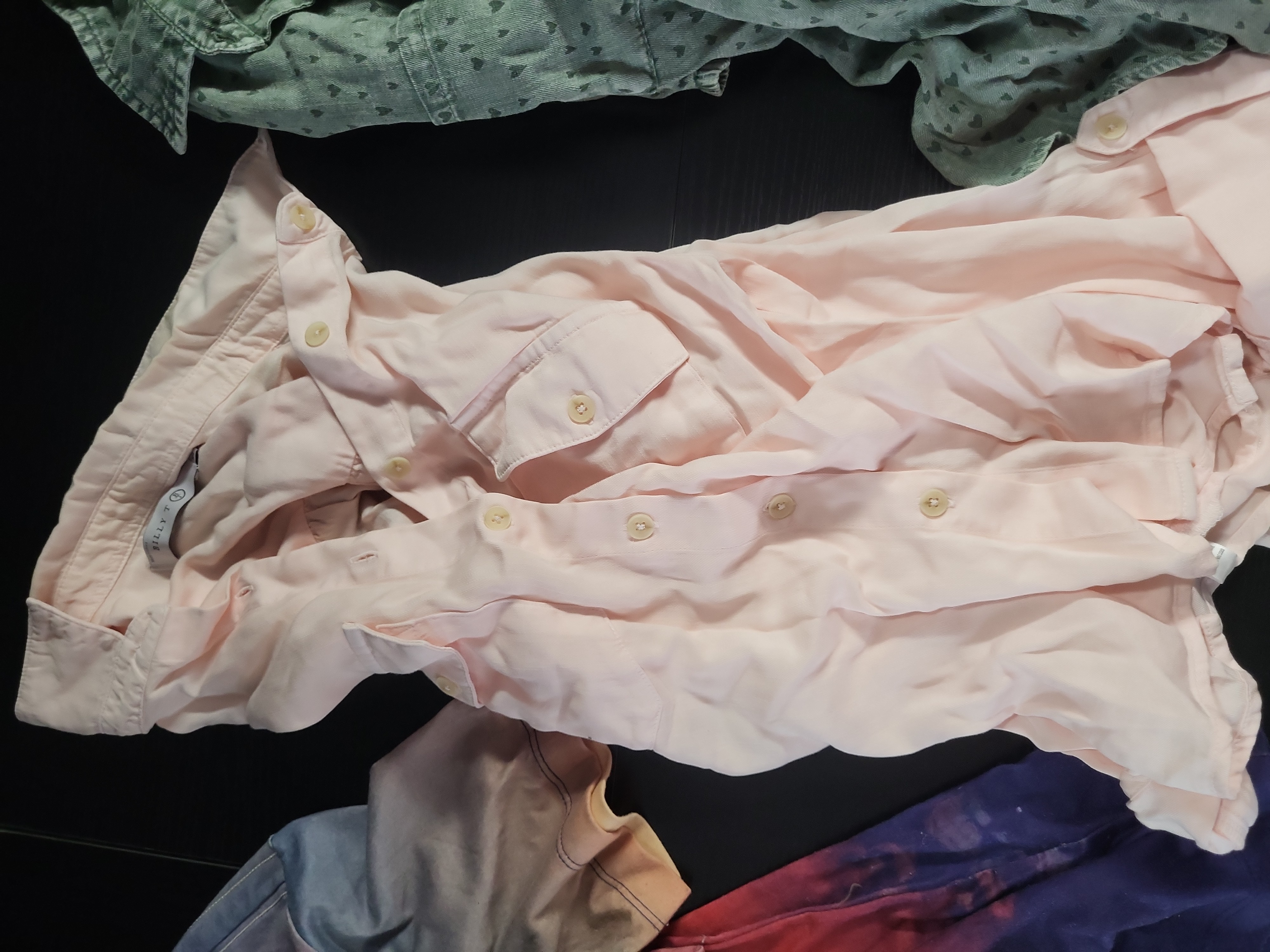 All garments are in good pre-owned condition with visible surface wrinkling from storage. The paint-splatter effects on the gray T-shirt and the frayed, raw-edge hems on the Billy T chambray and plaid shirts are intentional design elements. No significant stains, holes, or repairs were observed.
