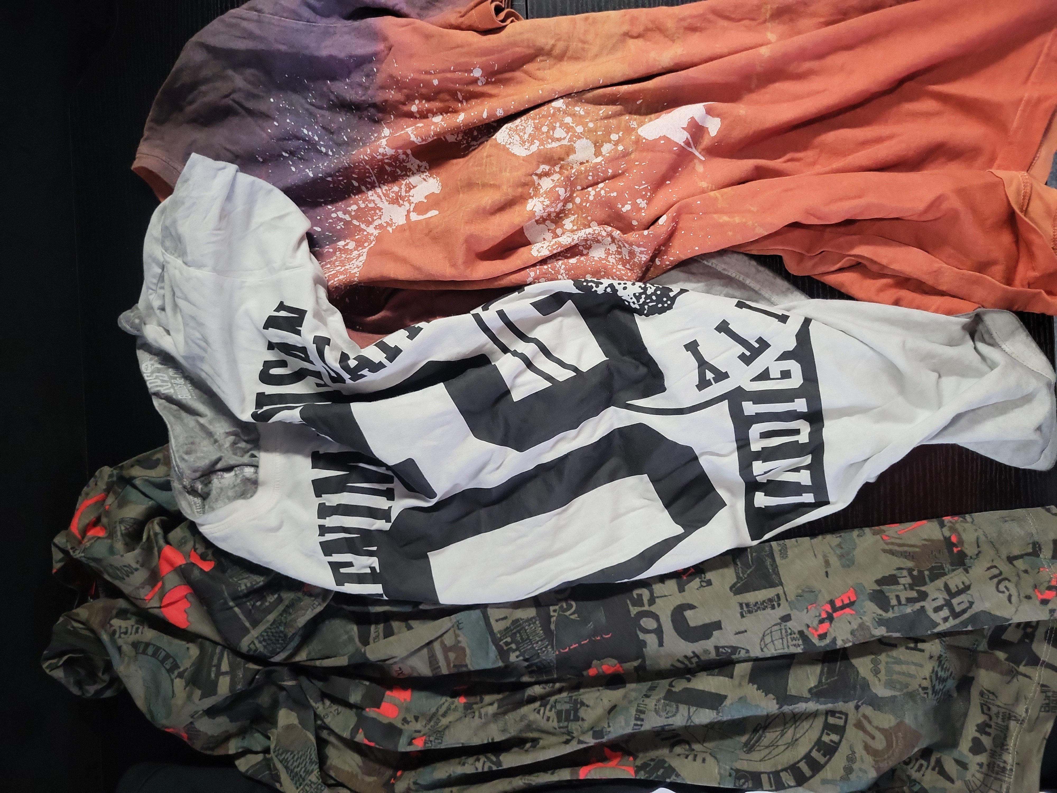 This lot features a collection of contemporary 21st-century casual and athletic shirts. The group includes various short-sleeve and long-sleeve t-shirts featuring standard crew necks and straight-cut hems. Construction utilizes a mix of cotton jersey and synthetic performance polyester blends. Decorative techniques include screen-printed graphics, sublimated patterns, and heat-applied logos. Notable items include three Adidas brand shirts: one green and tan camouflage print, one solid black with a raised white logo, and one black shirt with white vertical stripes. The collection also includes a white graphic shirt with Indian City 53 lettering, a purple to orange ombre shirt with white splatter effects, and a complex industrial-style graphic print shirt. Labels include Adidas with production origins including Cambodia. Measurements: Sizes vary; specific measurements not provided.
