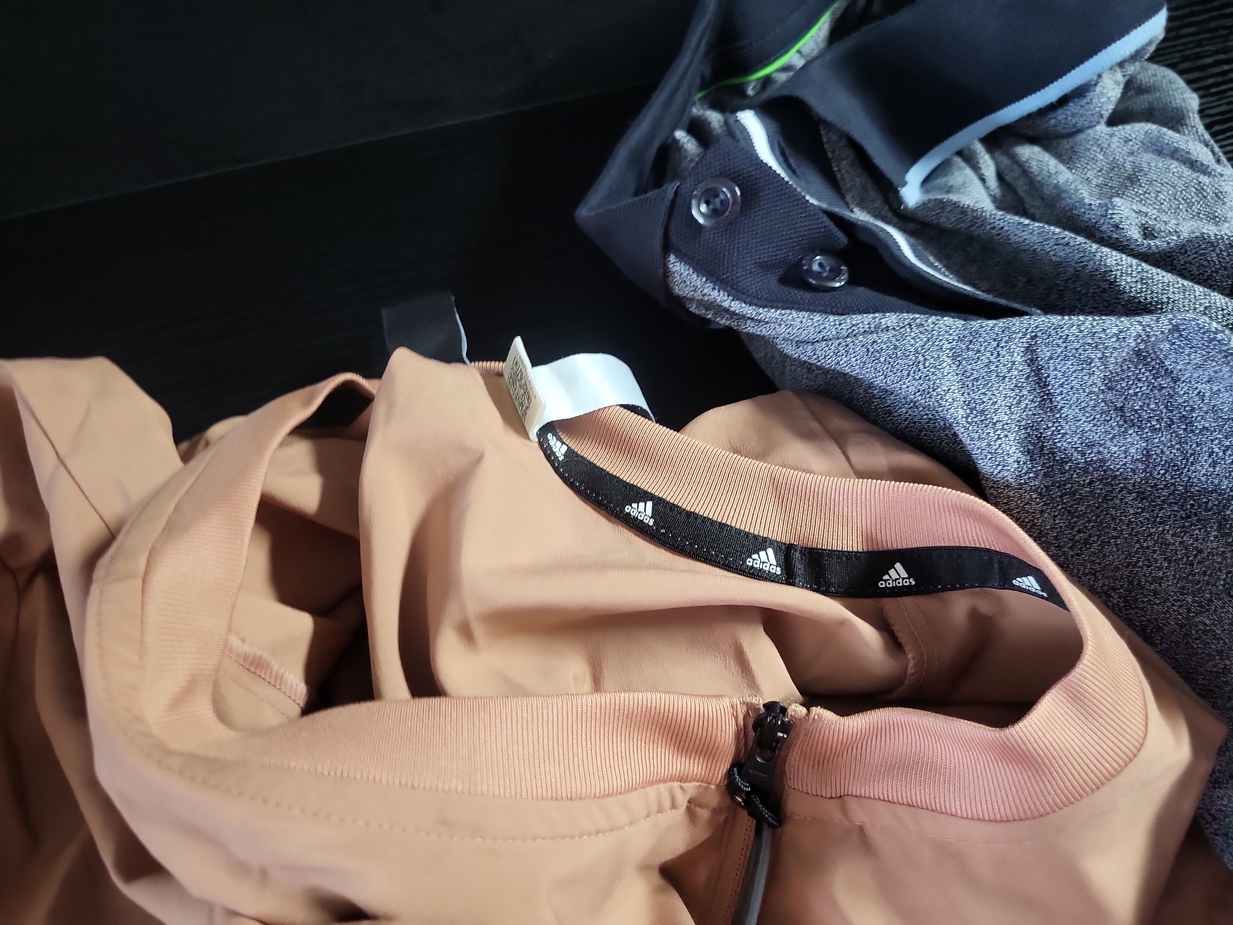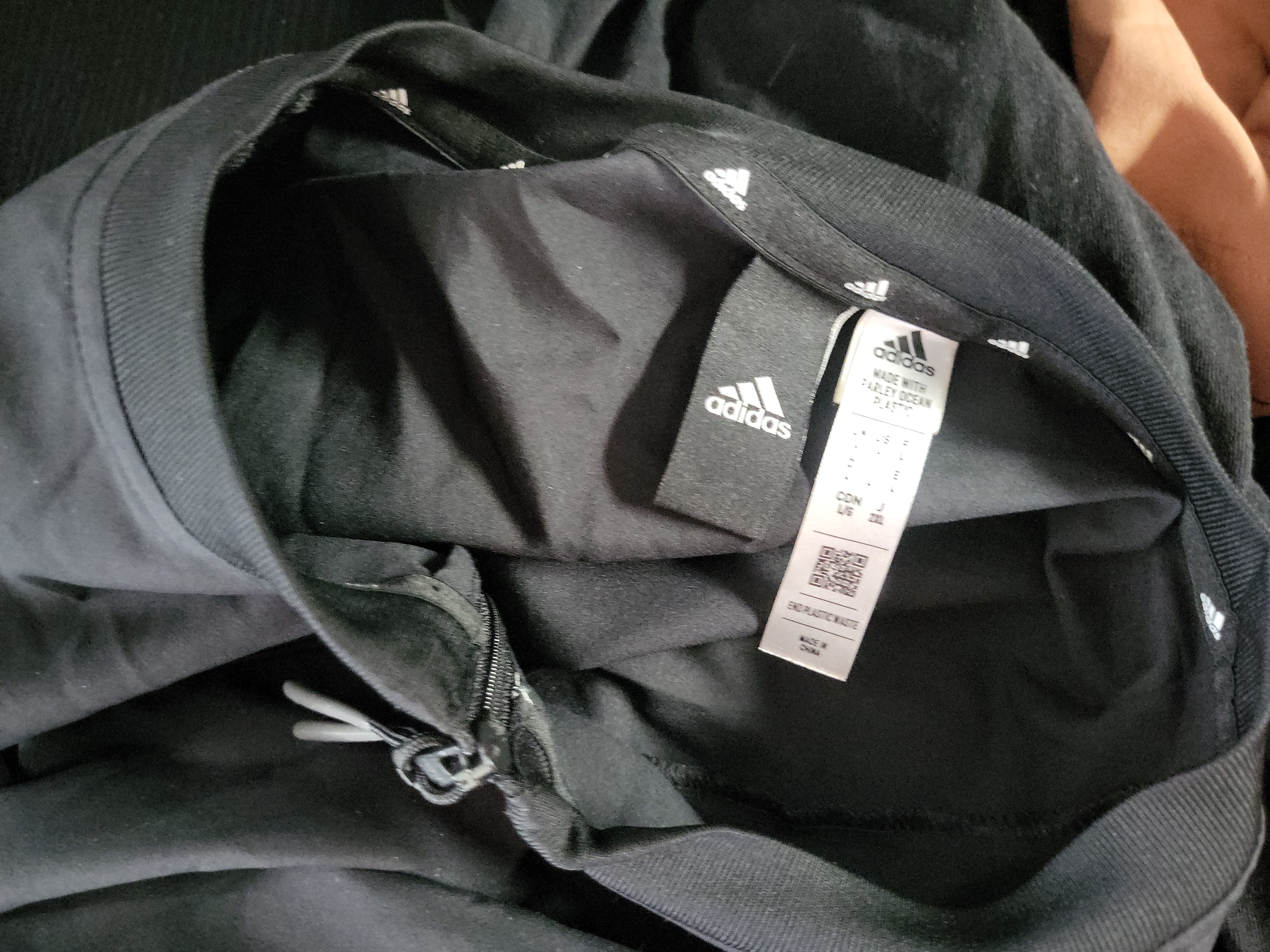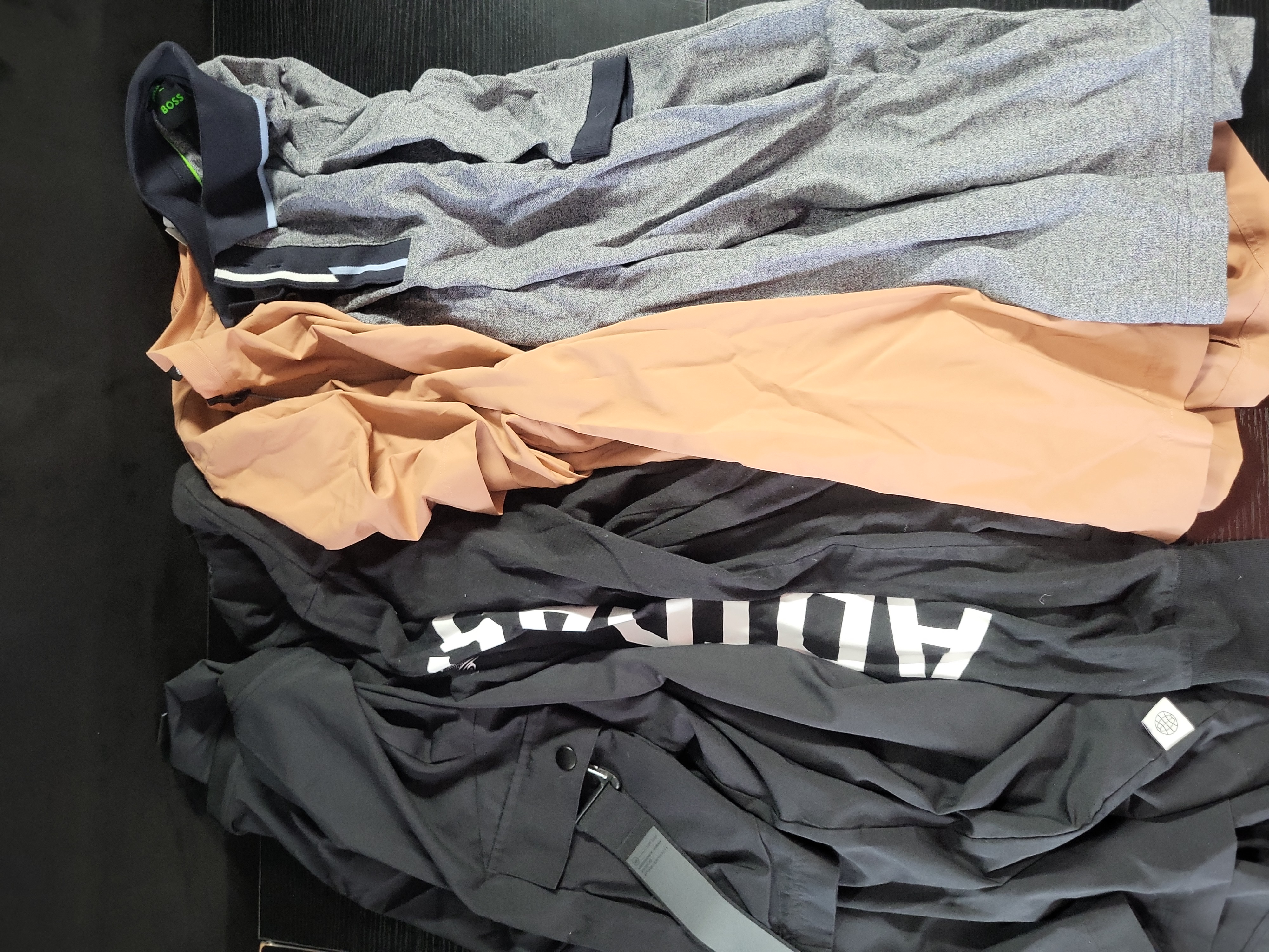 A collection of men’s athletic and casual apparel featuring pieces from BOSS and Adidas. The lot includes a BOSS long-sleeve polo-style shirt crafted from a heather gray jersey knit, featuring a navy blue collar accented with light blue and white horizontal stripes. Also included is an Adidas lightweight windbreaker jacket in a peach synthetic performance fabric, designed with a ribbed stand-up collar and front zipper. The set further contains an Adidas black long-sleeve crewneck top with large white graphic lettering and ribbed cuffs. Completing the collection is a pair of Adidas black technical performance pants from the sustainable Parley Ocean Plastic line, featuring a buckled strap and snap button details. The pants are labeled as a US size L. Fabrics consist of cotton blends and recycled synthetic performance materials. Measurements: Not provided.