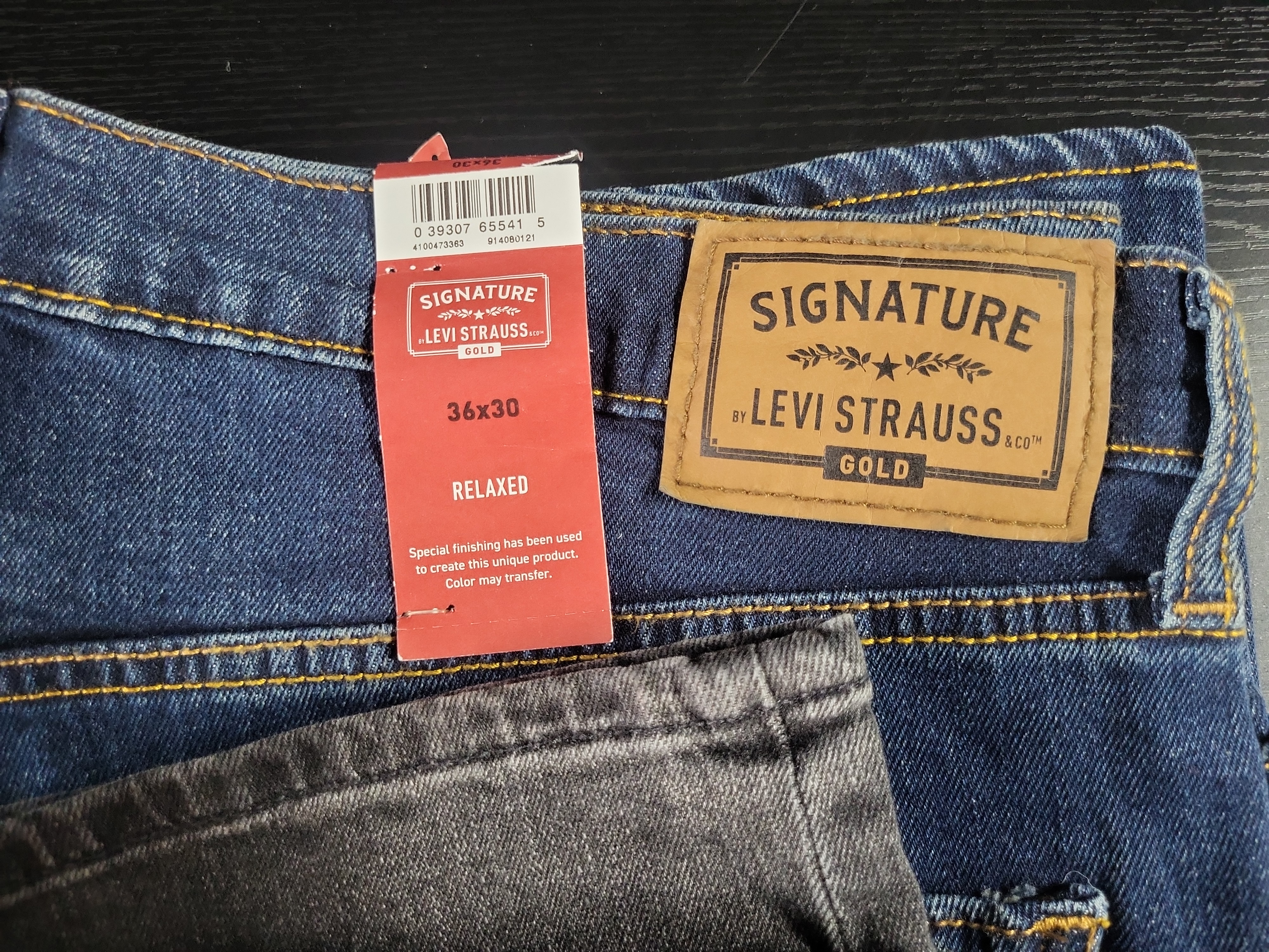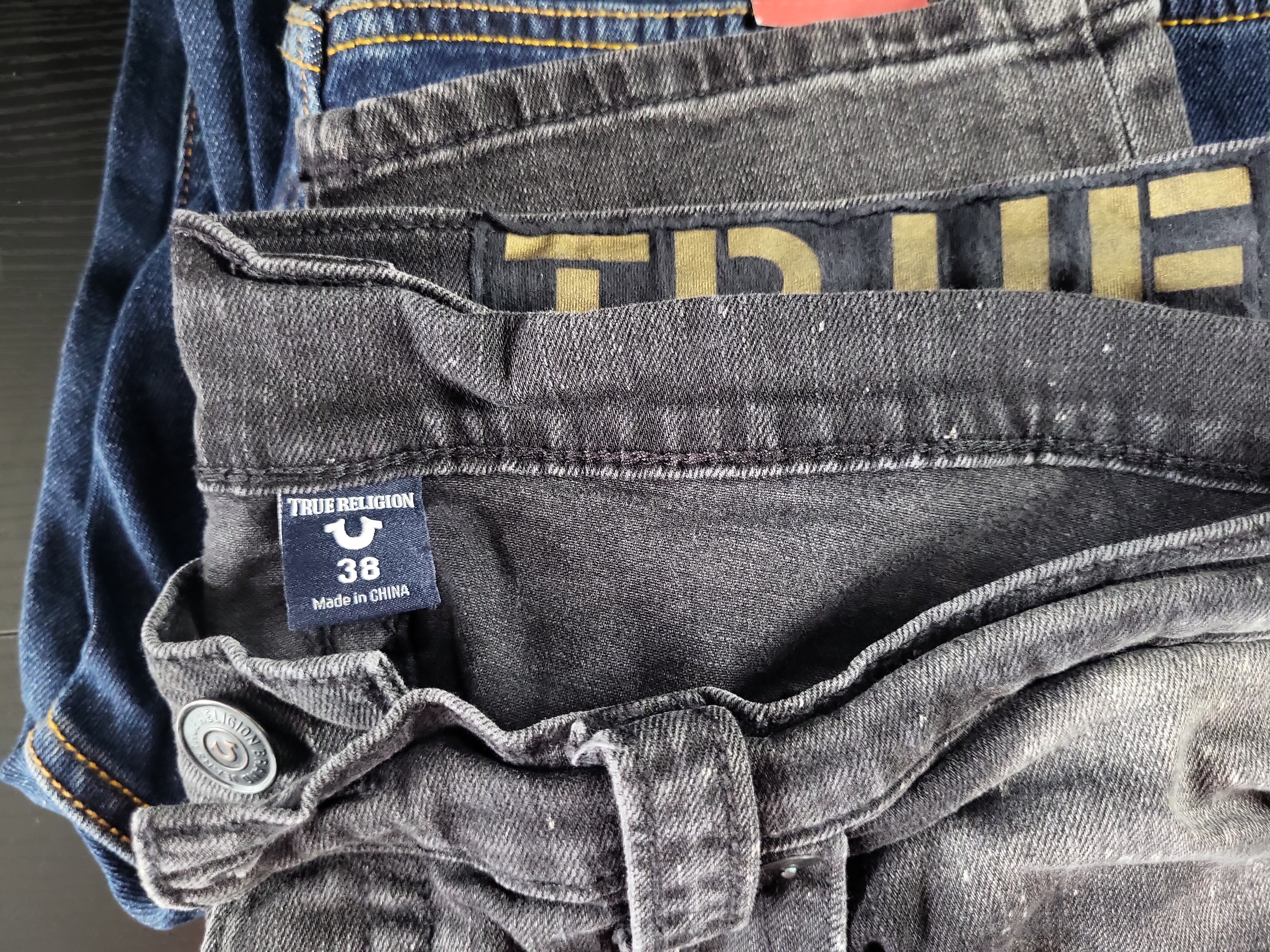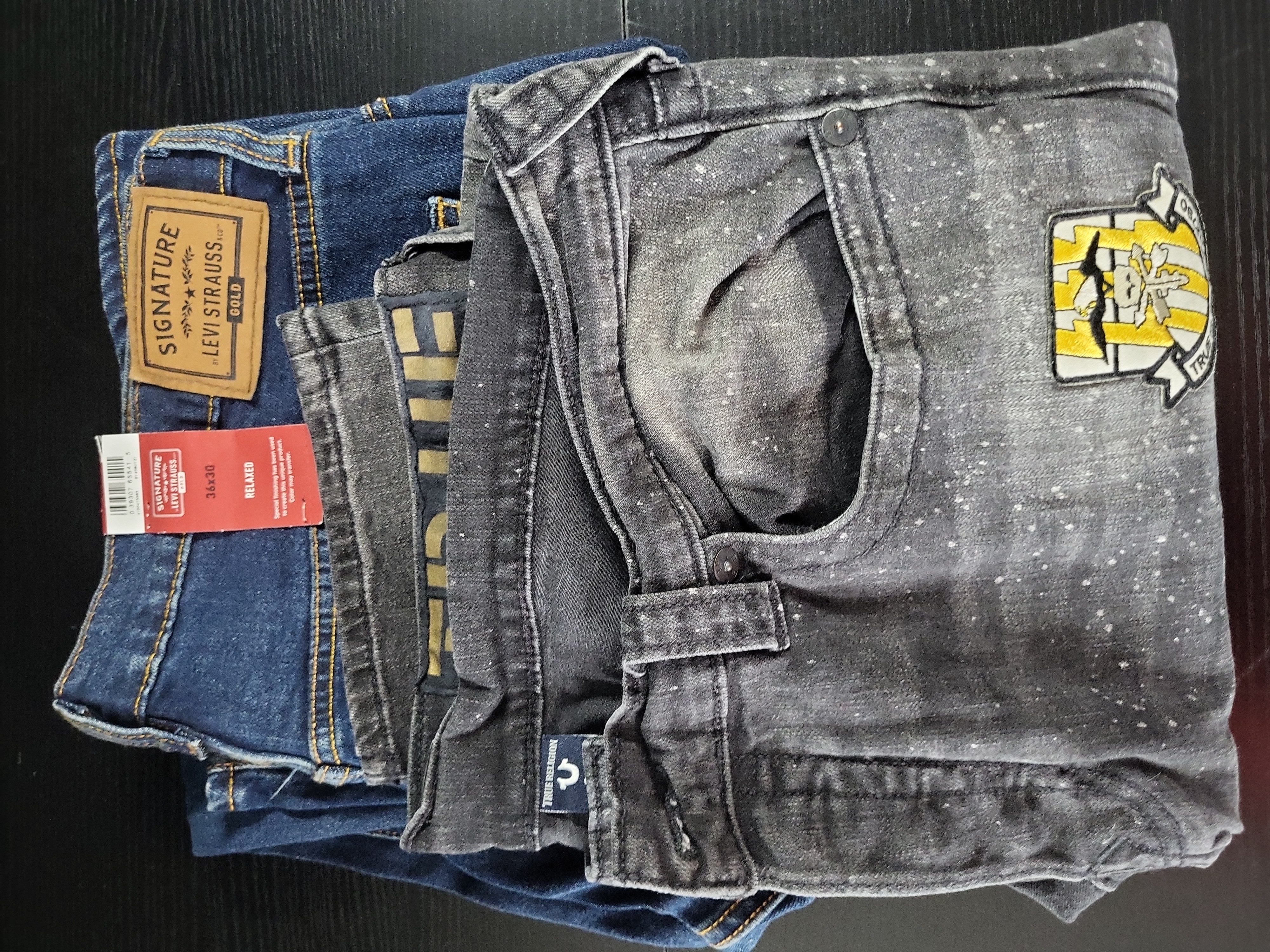 The Signature by Levi Strauss jeans are in excellent, new-with-tags condition. The True Religion jeans are in good pre-owned condition; the distressed appearance, fading, and paint splatter are intentional features of the garment\'s design. All closures are functional.
