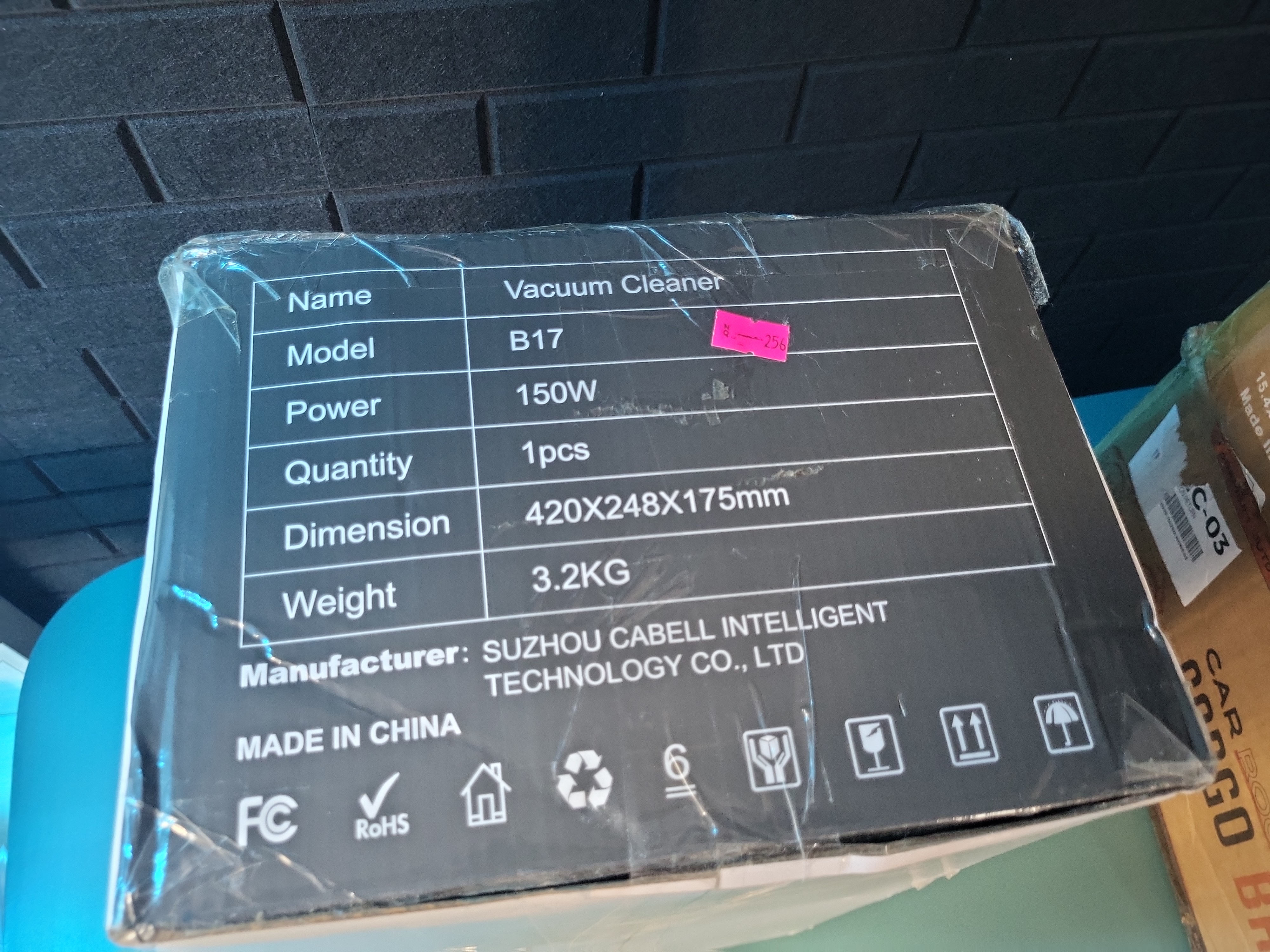Honki model B17 cordless stick vacuum cleaner, manufactured by Suzhou Cabell Intelligent Technology Co., Ltd. This unit features a 150W power rating and is finished in a white and yellow color scheme. Specifications provided on the packaging indicate a weight of 3.2kg and dimensions of 420 x 248 x 175mm. The item is presented in its original retail packaging. Made in China.