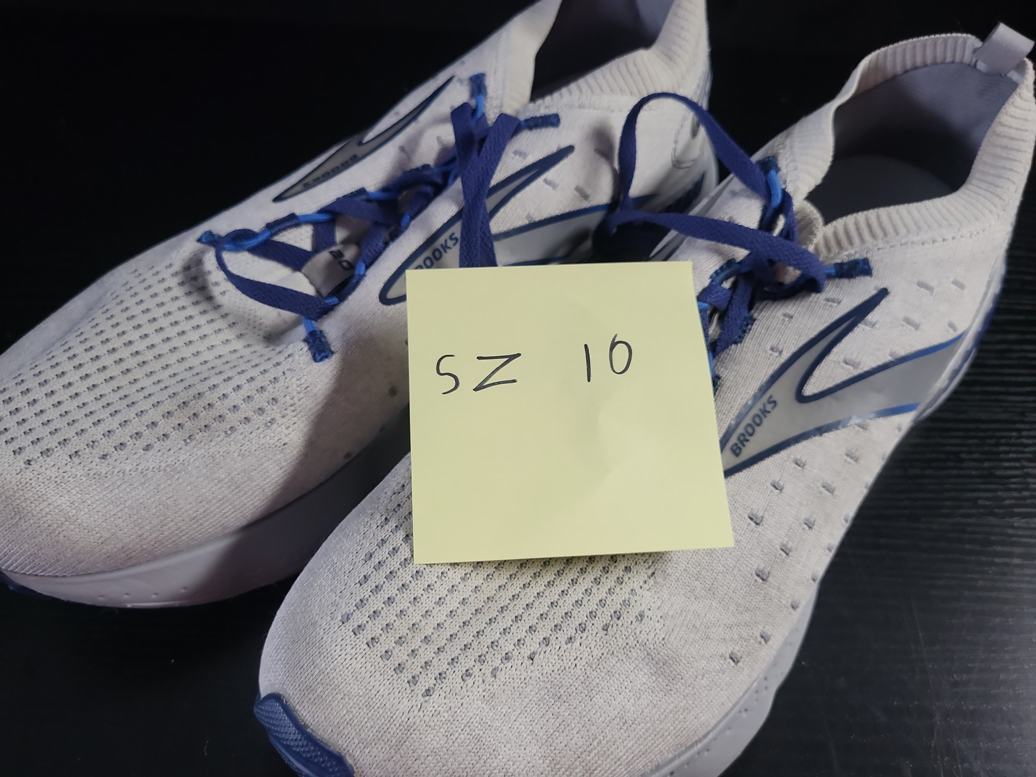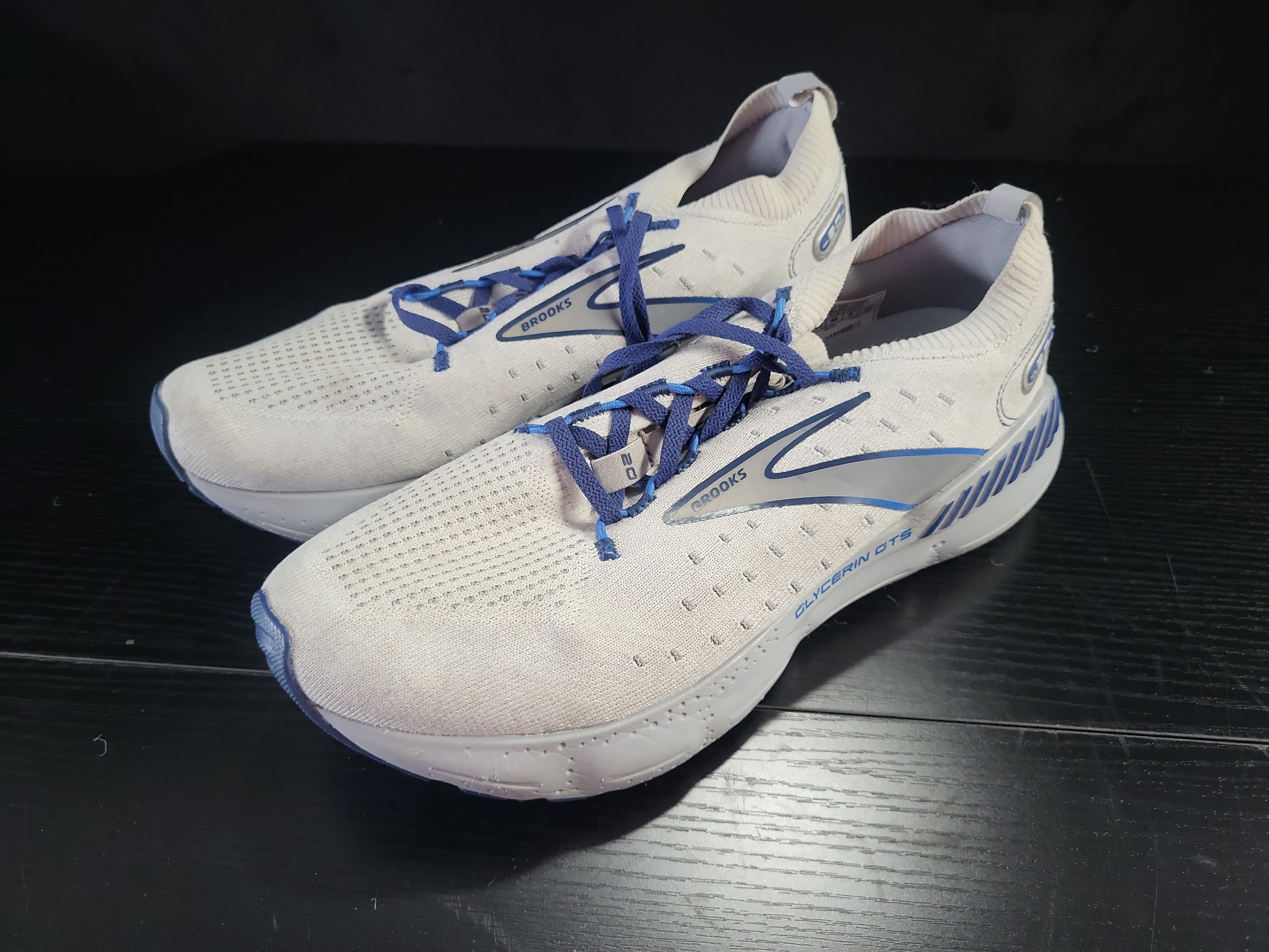 BID PER WHAT YOU SEE IN THE PHOTO, NOT THE AI GENERATED TITLES AND DESCRIPTIONS! A Pair of Brooks Glycerin StealthFit GTS 20 Men’s Running Shoes, Size 10, Grey and Blue