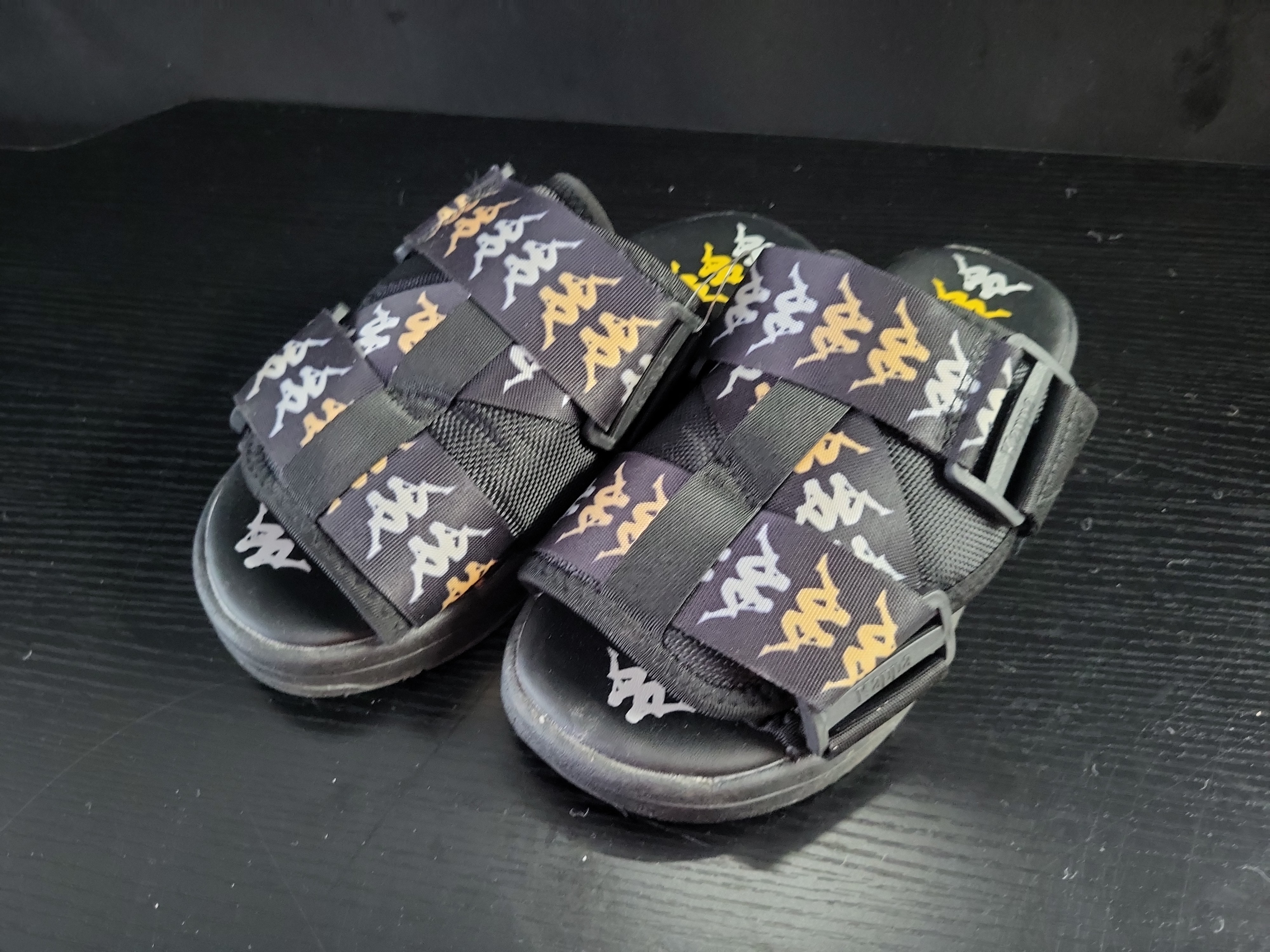 BID PER WHAT YOU SEE IN THE PHOTO, NOT THE AI GENERATED TITLES AND DESCRIPTIONS! Kappa 222 Banda Mitel Adjustable Strap Sandals, Size 8, Black and Gold