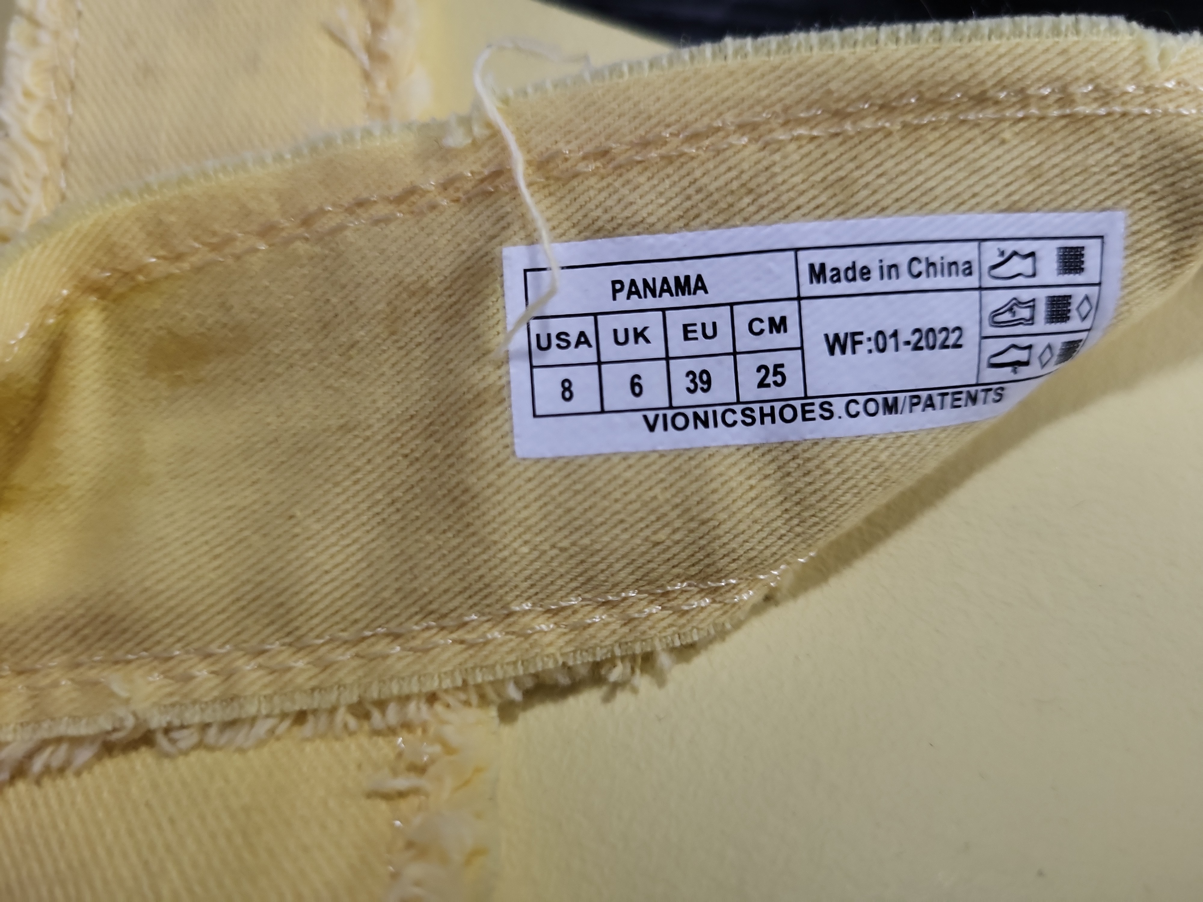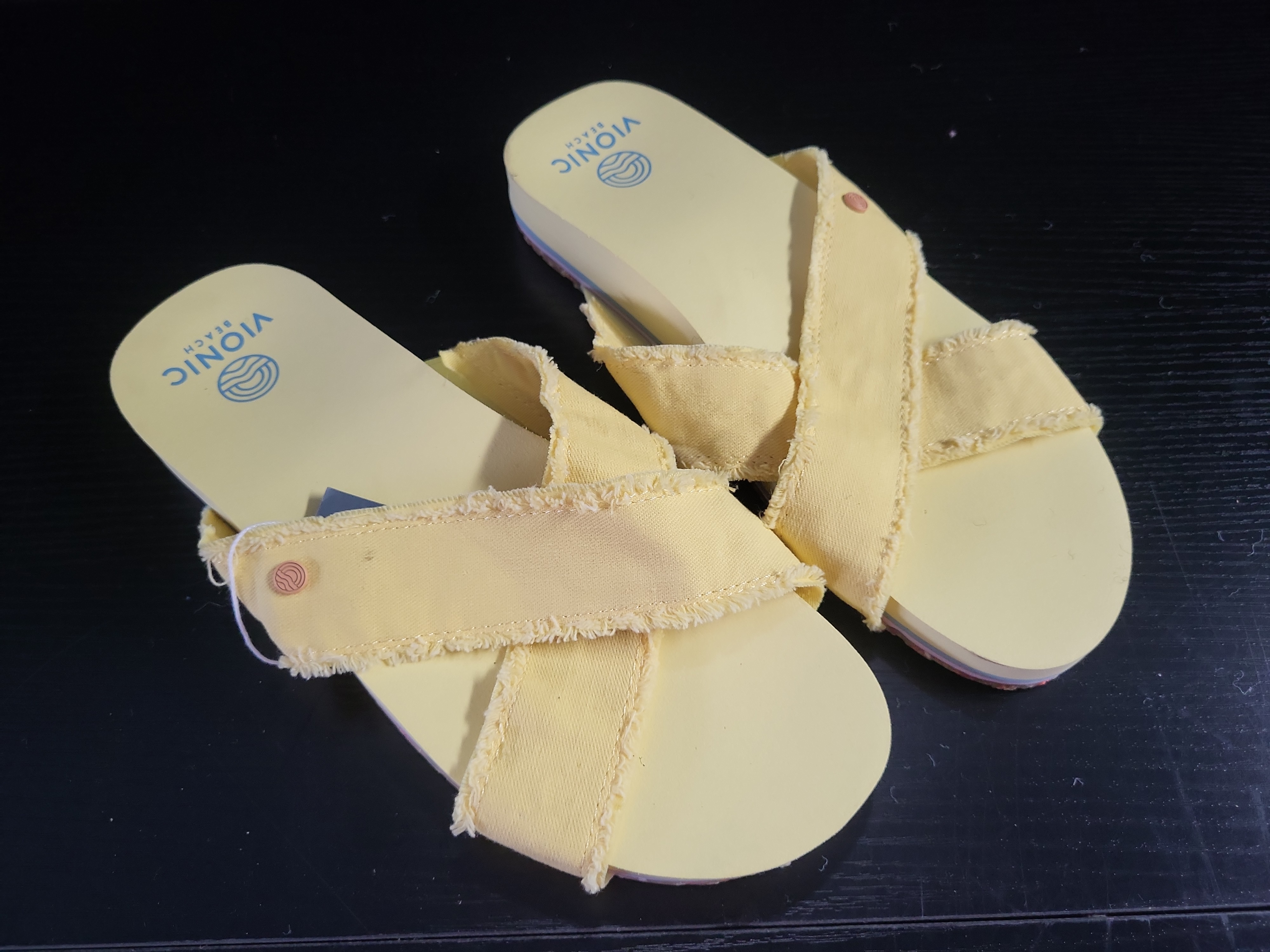 Brand: Vionic (Vionic Beach line). Style: Panama platform slide sandal. Size: Women’s USA 8, UK 6, EU 39, CM 25. Material: Textile canvas upper with frayed edges and a synthetic EVA platform footbed and outsole. Color: Light yellow. Heel Height: Approximately 1.25-inch platform. This pair features wide, criss-cross straps with intentional factory-frayed detailing. Original packaging and dust bags are not included.