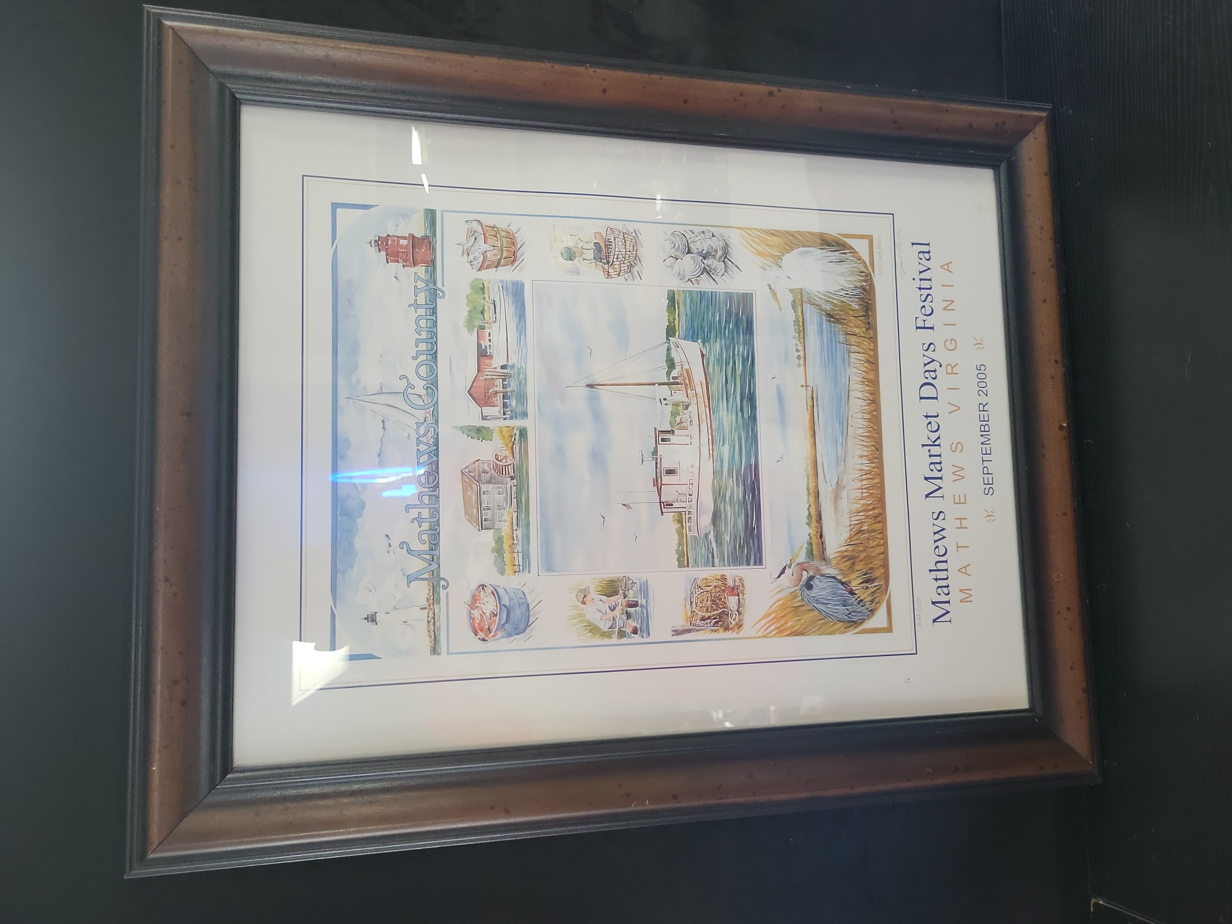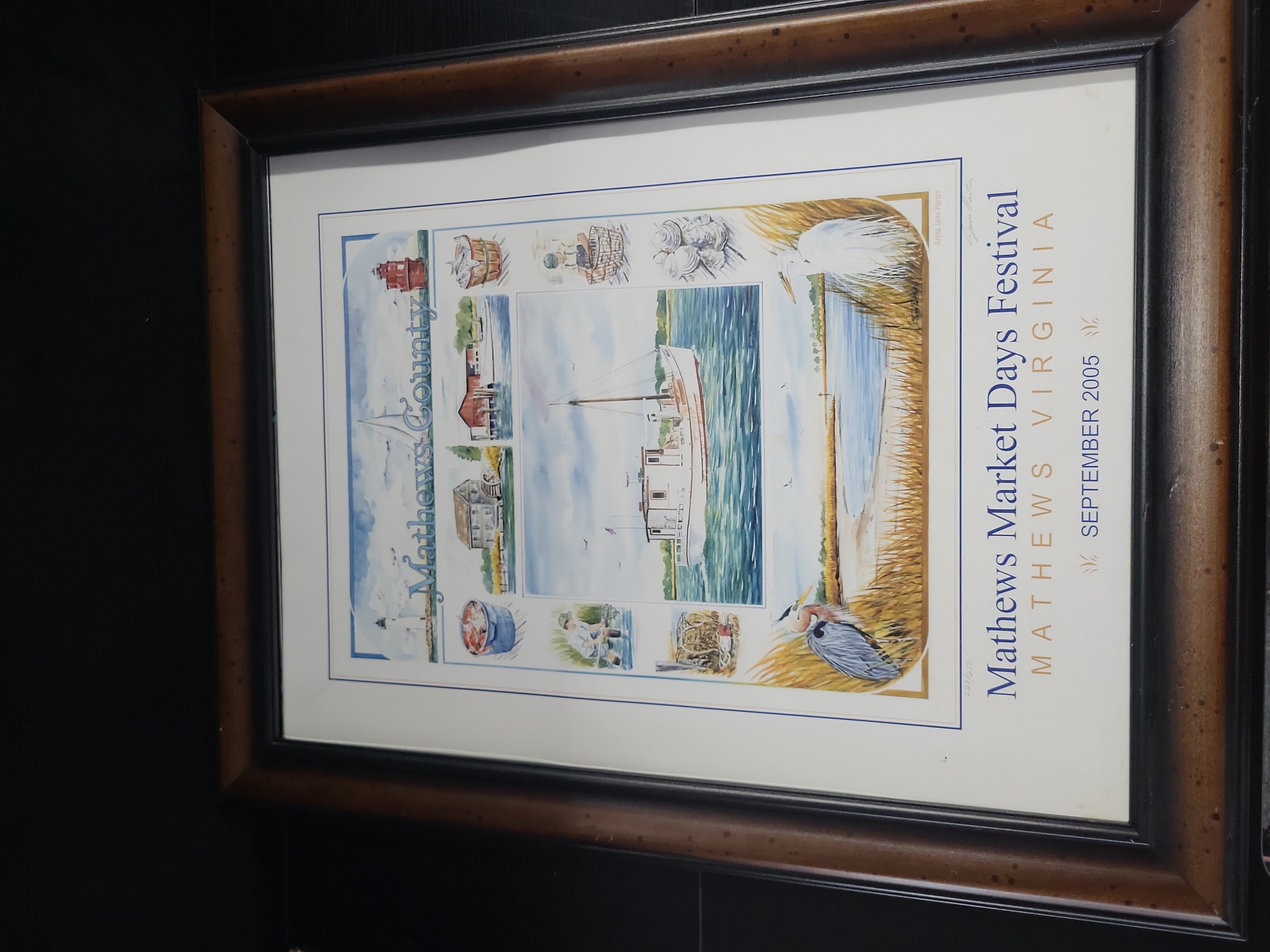 Jane Partin (American). This offset lithographic commemorative poster was produced for the 2005 Mathews Market Days Festival in Mathews, Virginia. The composition, based on an original watercolor, features a central deadrise workboat surrounded by various coastal vignettes, including the New Point Comfort Lighthouse, blue crabs, oysters, and herons. The text Mathews County runs vertically along the left border, while the festival title and date are printed on the right. The print is hand-numbered 220/500 and hand-signed by the artist in pencil in the lower right margin; it also includes a printed credit on the right border reading Artist: Jane Partin. The work is presented in a dark wood frame with a metallic inner lip. Image size: Dimensions unavailable; Sheet size: Dimensions unavailable.