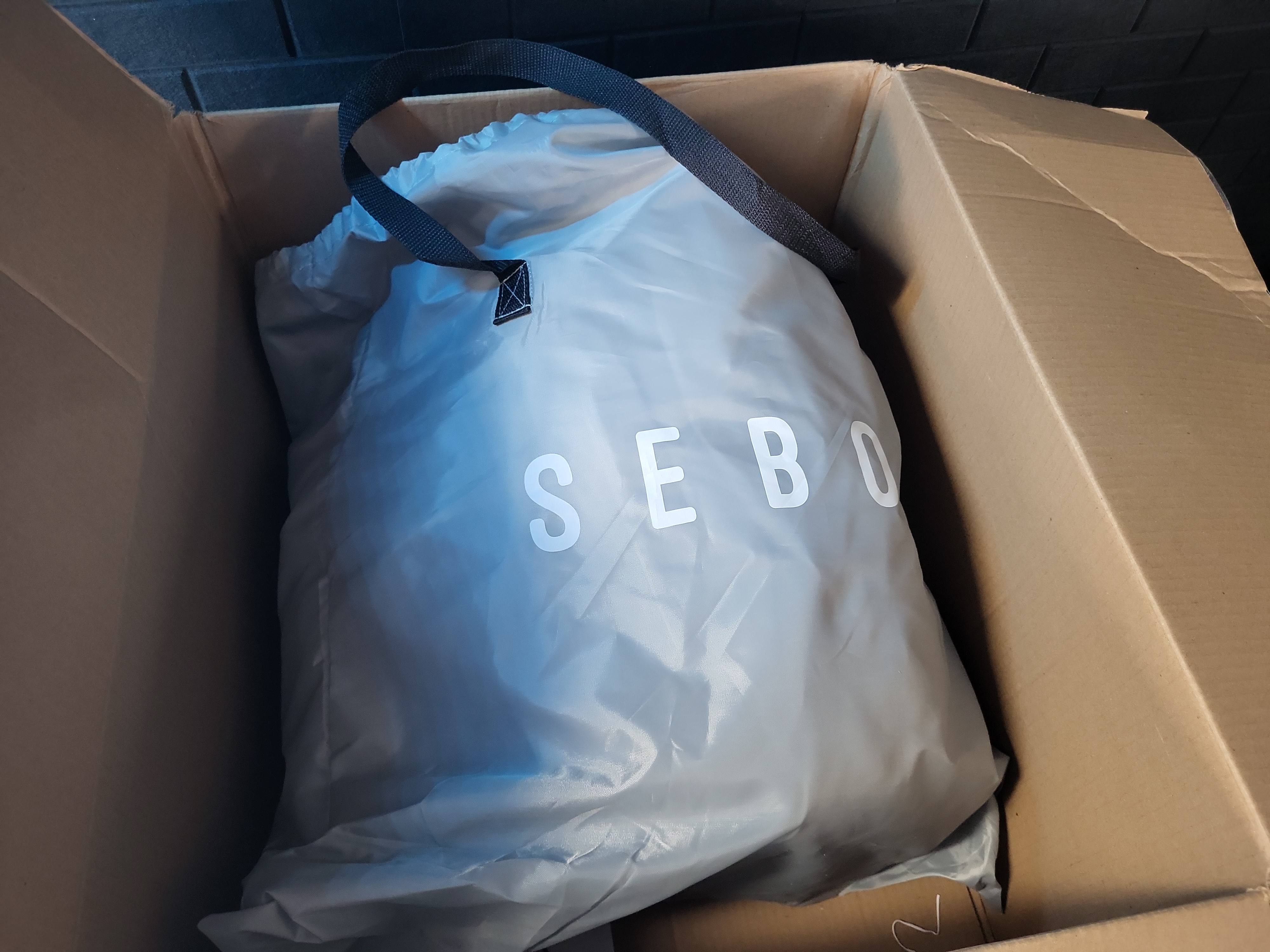 This wholesale lot features one (1) SEBO brand inflatable air mattress. The unit is manufactured from white PVC material, featuring printed instructional text on the mattress surface regarding material stretching and inflation maintenance. The item is housed in a gray branded drawstring carrying bag with black handles. This appears to be a single-unit customer return or open-box item, as the mattress is loosely folded within the bag and shows evidence of previous handling.
