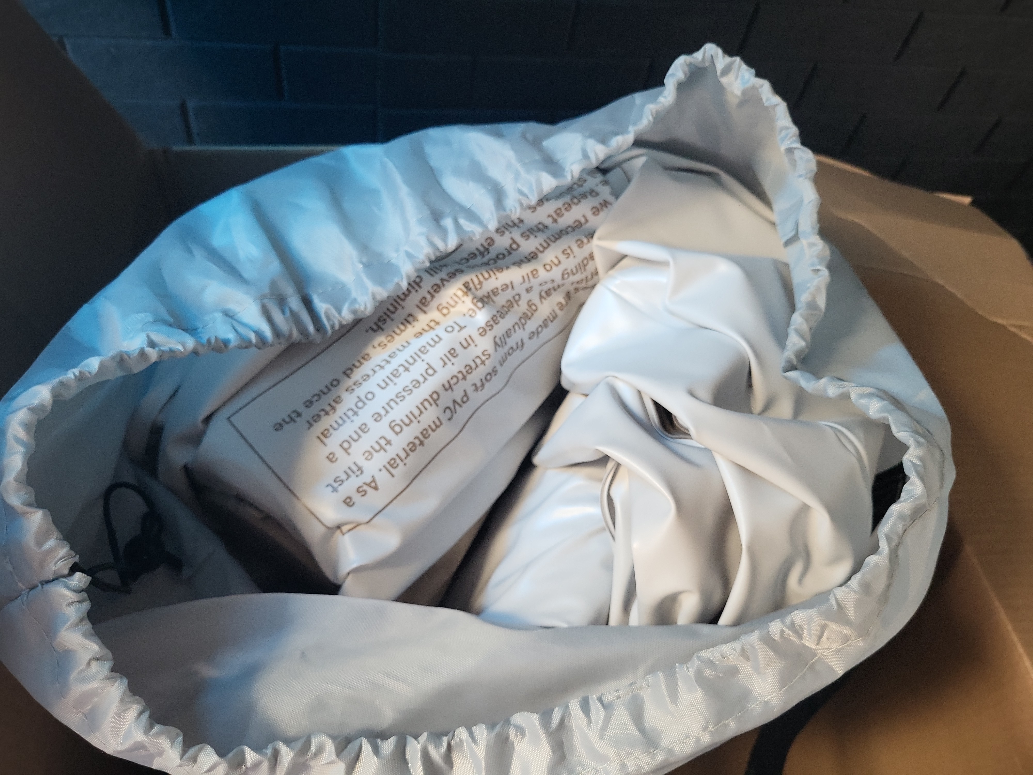 Open-box return (100%). The item is not in its original retail box and is currently stored in its branded carrying bag inside a plain brown shipping carton. The mattress shows signs of being unpacked and handled.