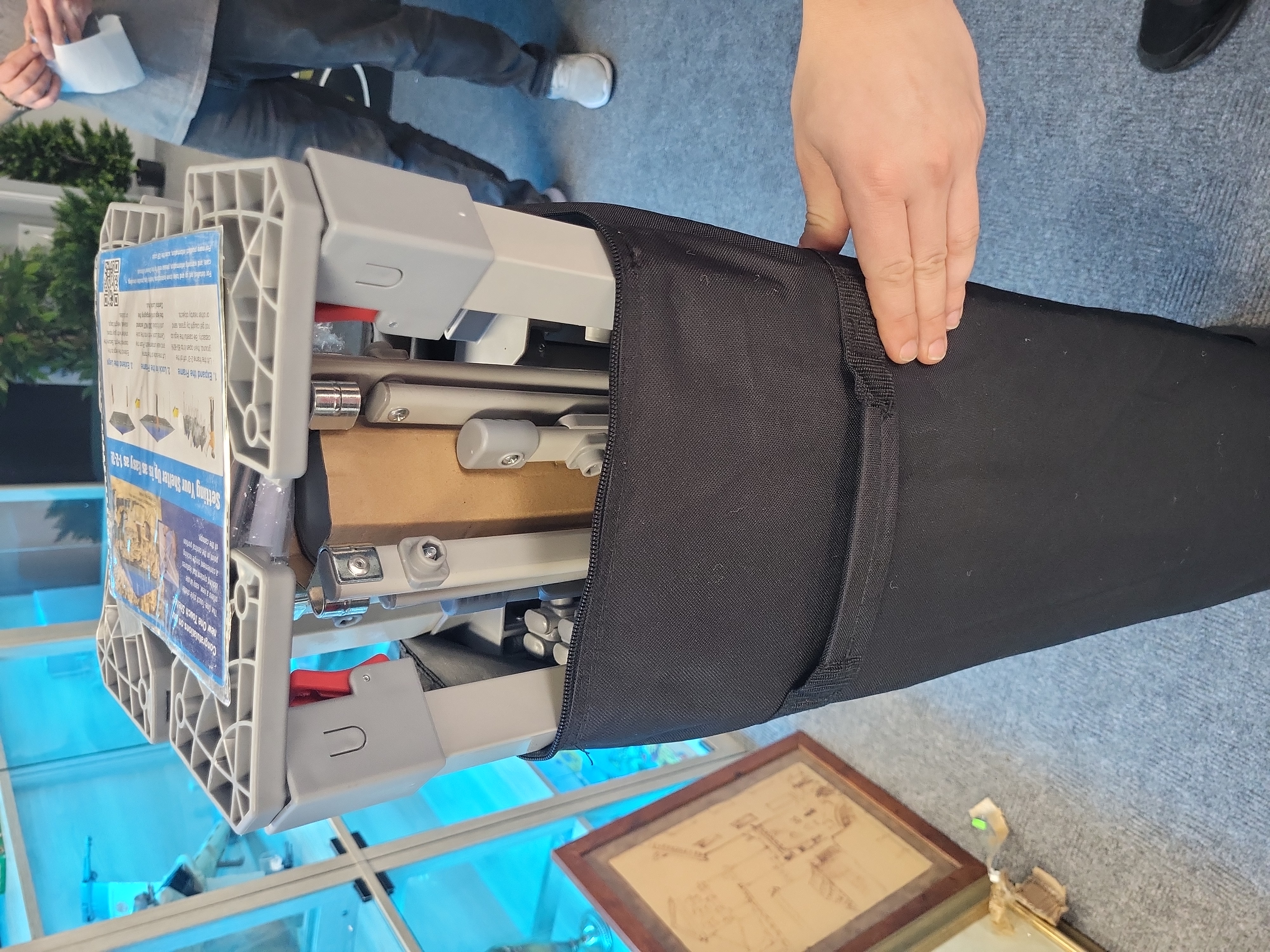 The item is in good used condition. The frame remains compactly folded with no visible signs of structural damage or heavy wear to the joints. The carrying case is functional with an intact zipper and handles. The canopy fabric is contained within the frame and was not fully unpacked for inspection.