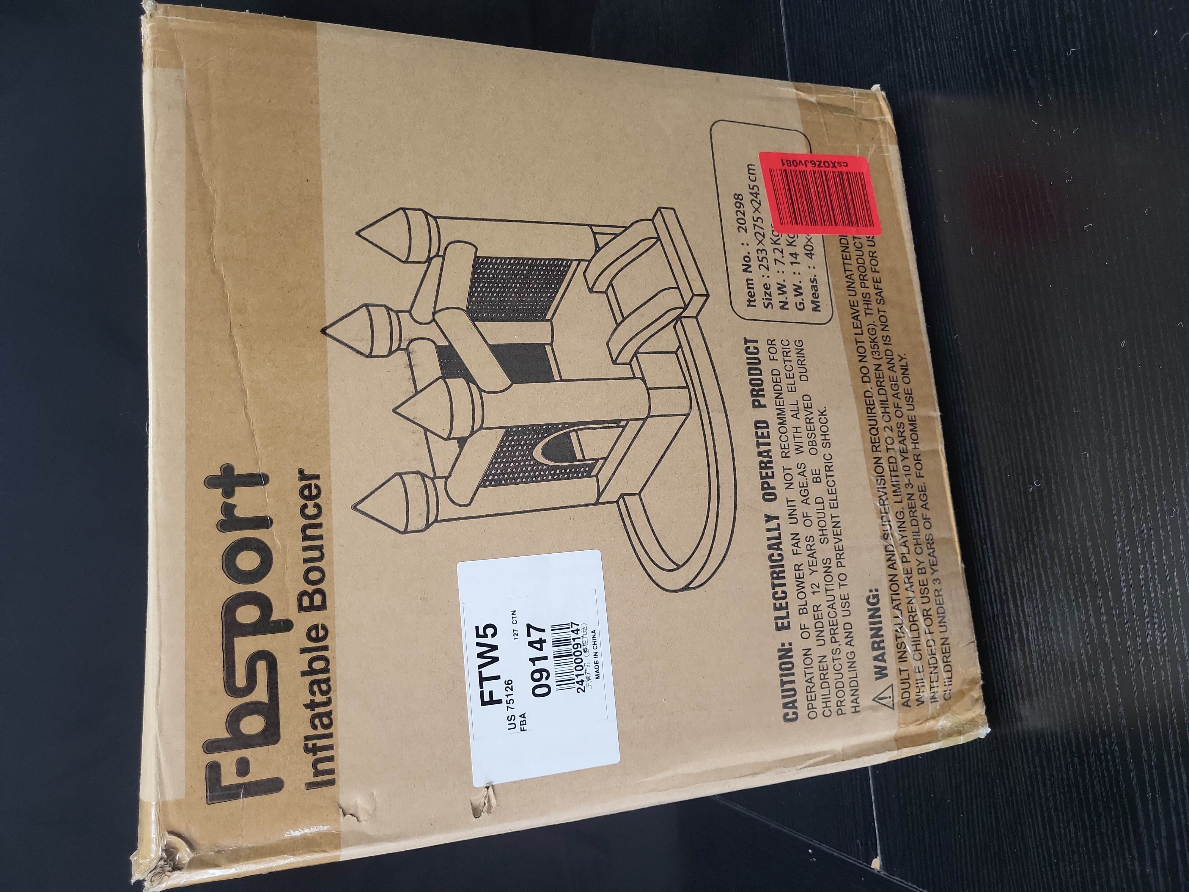 This listing is for one fbsport brand inflatable castle bouncer, identified by item number 20298. This is a large-scale outdoor play structure with approximate inflated dimensions of 253 by 275 by 245 centimeters. The product is electrically operated and designed for children’s use under adult supervision. The unit has a gross weight of 14 kilograms and a net weight of 7.2 kilograms. The original shipping box features stylized branding and includes inventory labels indicating it was handled through direct warehouse channels.
