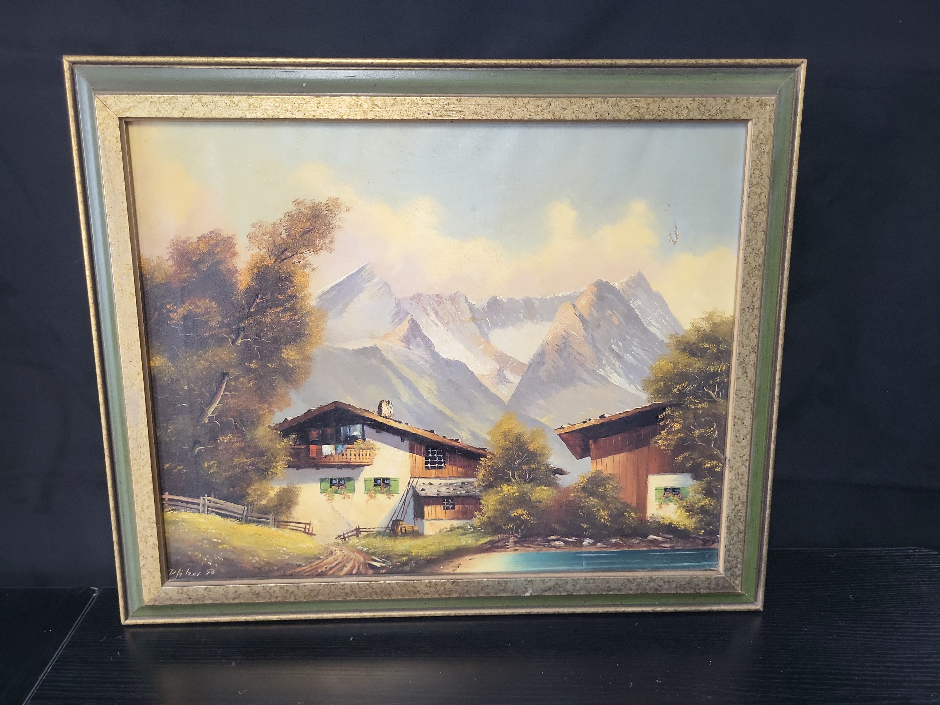 Pfizer (20th Century), oil on stretched canvas. This mid-century landscape depicts an Alpine scene featuring traditional chalets nestled in a valley before towering, snow-capped peaks. The composition includes a dirt path leading toward a white-walled chalet with green shutters, surrounded by mature trees and a tranquil body of water in the foreground under a hazy, yellowish sky. The style is representative of mid-century European decorative landscapes, characterized by a mix of blended strokes in the sky and more textured, impasto-like applications for the mountain highlights and foliage. The work is signed Pfizer 53 in the lower-left corner. It is presented in a period-appropriate frame consisting of a greenish-gray outer molding and a textured, gilded inner fillet. Provenance not provided. Dimensions not provided.