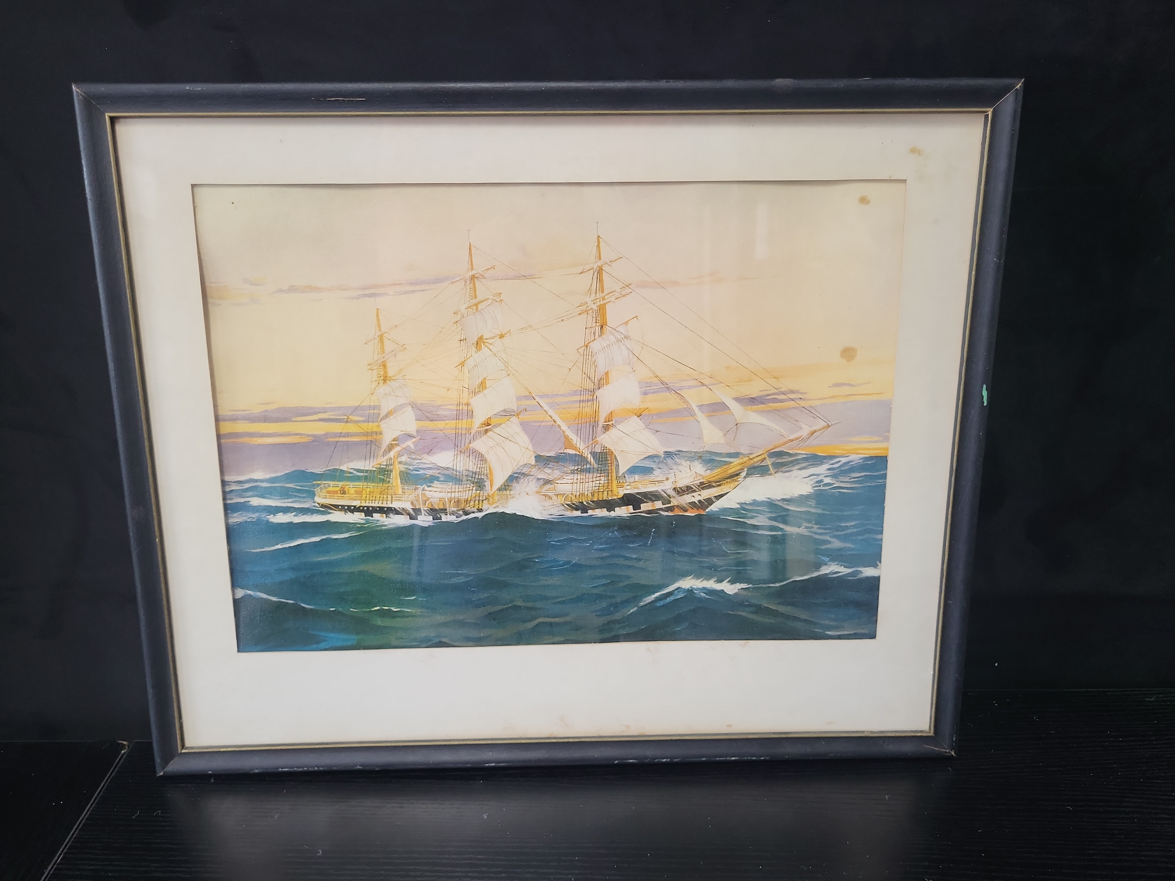 BID PER WHAT YOU SEE IN THE PHOTO, NOT THE AI GENERATED TITLES AND DESCRIPTIONS! Jack Spurling (British, 1870–1933), ‘Three-Masted Sailing Ship at Sea’, (Signed)
