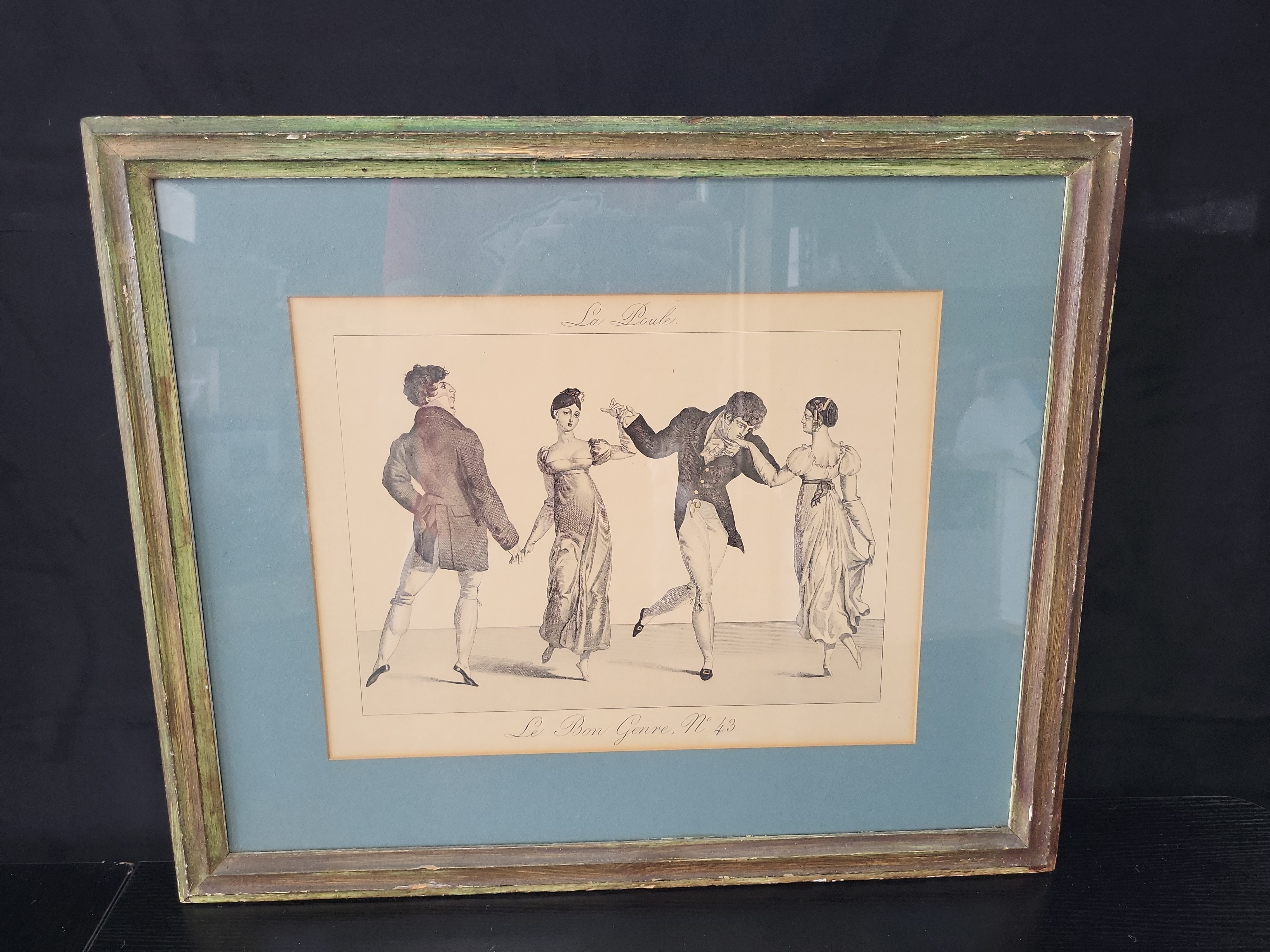 This engraving on paper is plate number 43 from the celebrated early 19th-century French satirical fashion series, Le Bon Genre, published by Pierre de la Mésangère. The work, titled La Poule, depicts four figures in elegant Empire-period attire performing a movement from a quadrille dance. The print is inscribed with the title at the top center and Le Bon Genre, N° 43. in the bottom center margin. As is characteristic of this series, the work is plate-signed with these inscriptions rather than hand-signed and does not bear a limited edition number. The series is renowned for its keen observation of Parisian social life and costume during the First Empire and Bourbon Restoration. The print is presented in a blue-green mat and a distressed, green-painted wooden frame. Image size approximately 7.5 x 10 inches; Sheet size approximately 10 x 13 inches.