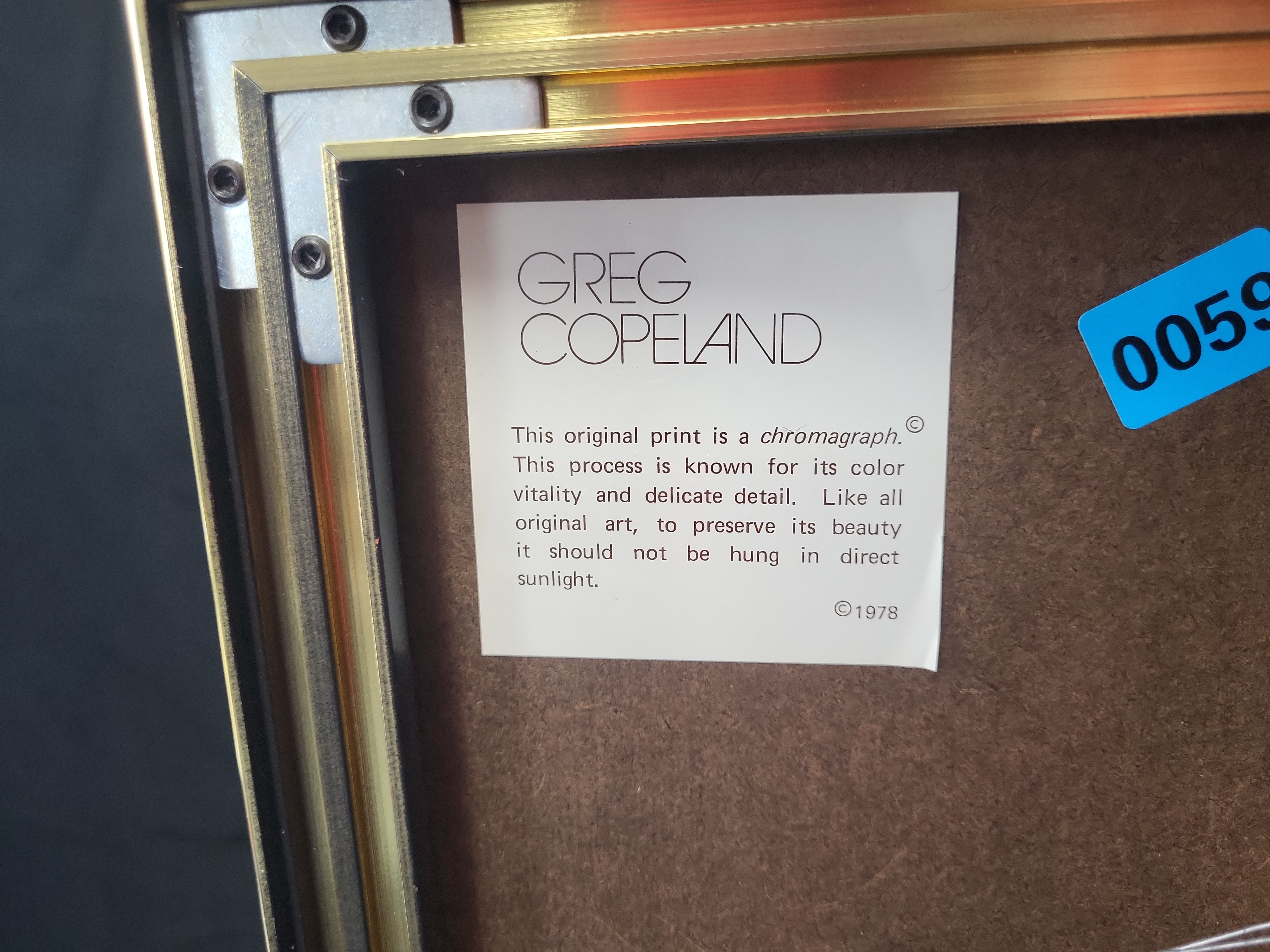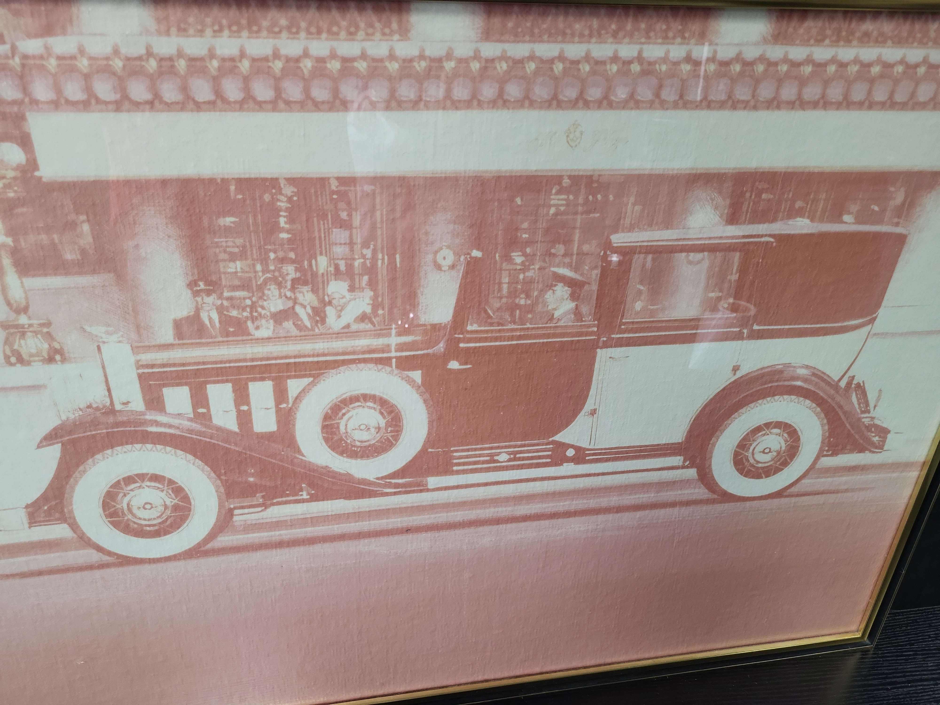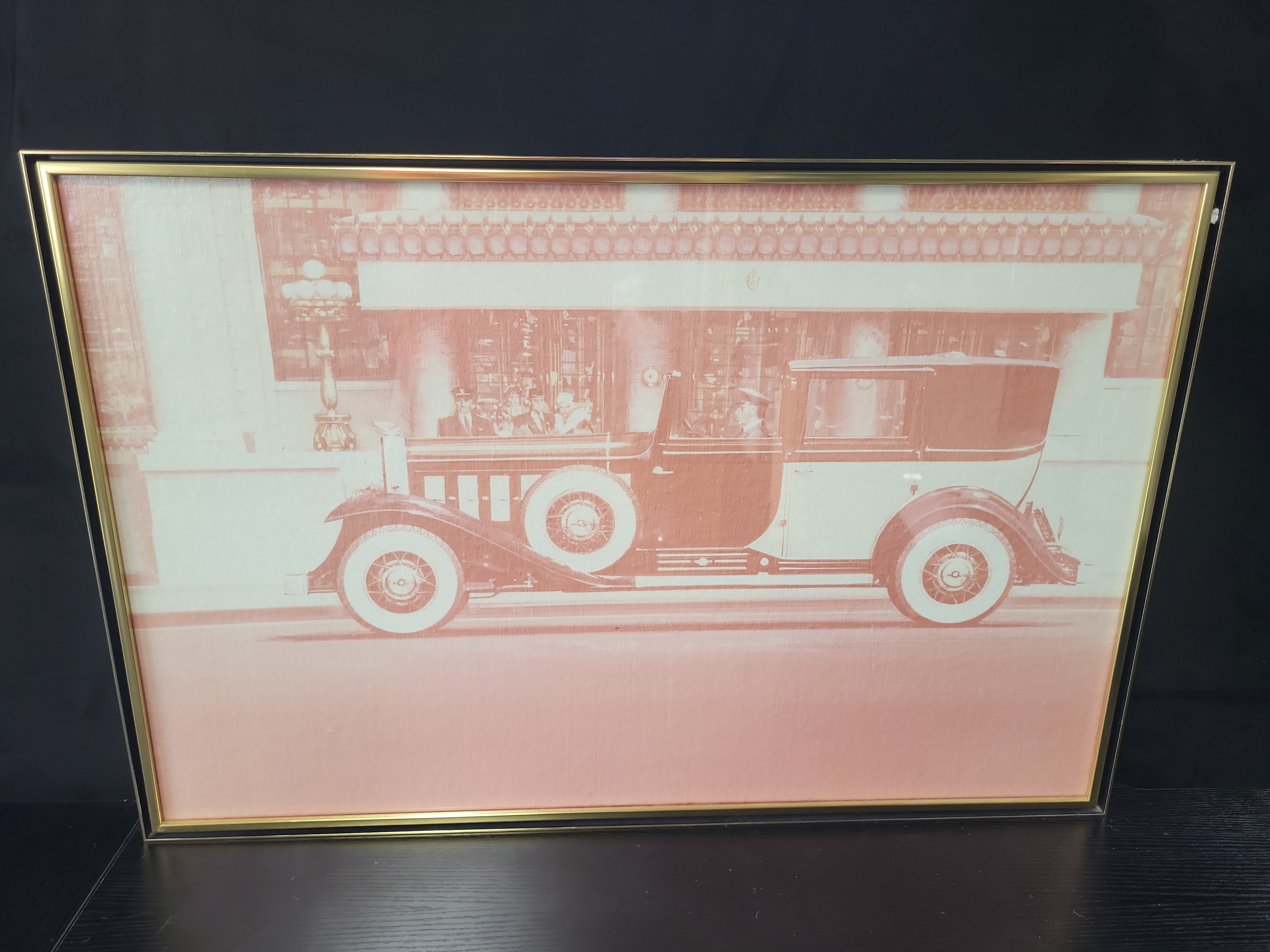 This original chromagraph print by Greg Copeland, produced in 1978, features a stylized depiction of a 1931 Cadillac Town Brougham. The image is rendered in a monochromatic pinkish-red tone on a textured substrate, capturing the vintage limousine with its chauffeur and figures in the background. The verso retains two original labels from the Greg Copeland studio in Fairfield, New Jersey. One label identifies the piece as an original print and a chromagraph, a proprietary process noted for its color vitality and detail, with a copyright date of 1978. The second label includes the handwritten style number 2125. The work is presented in a contemporary gold-toned and black metal frame. Dimensions: Image size and paper size not provided.