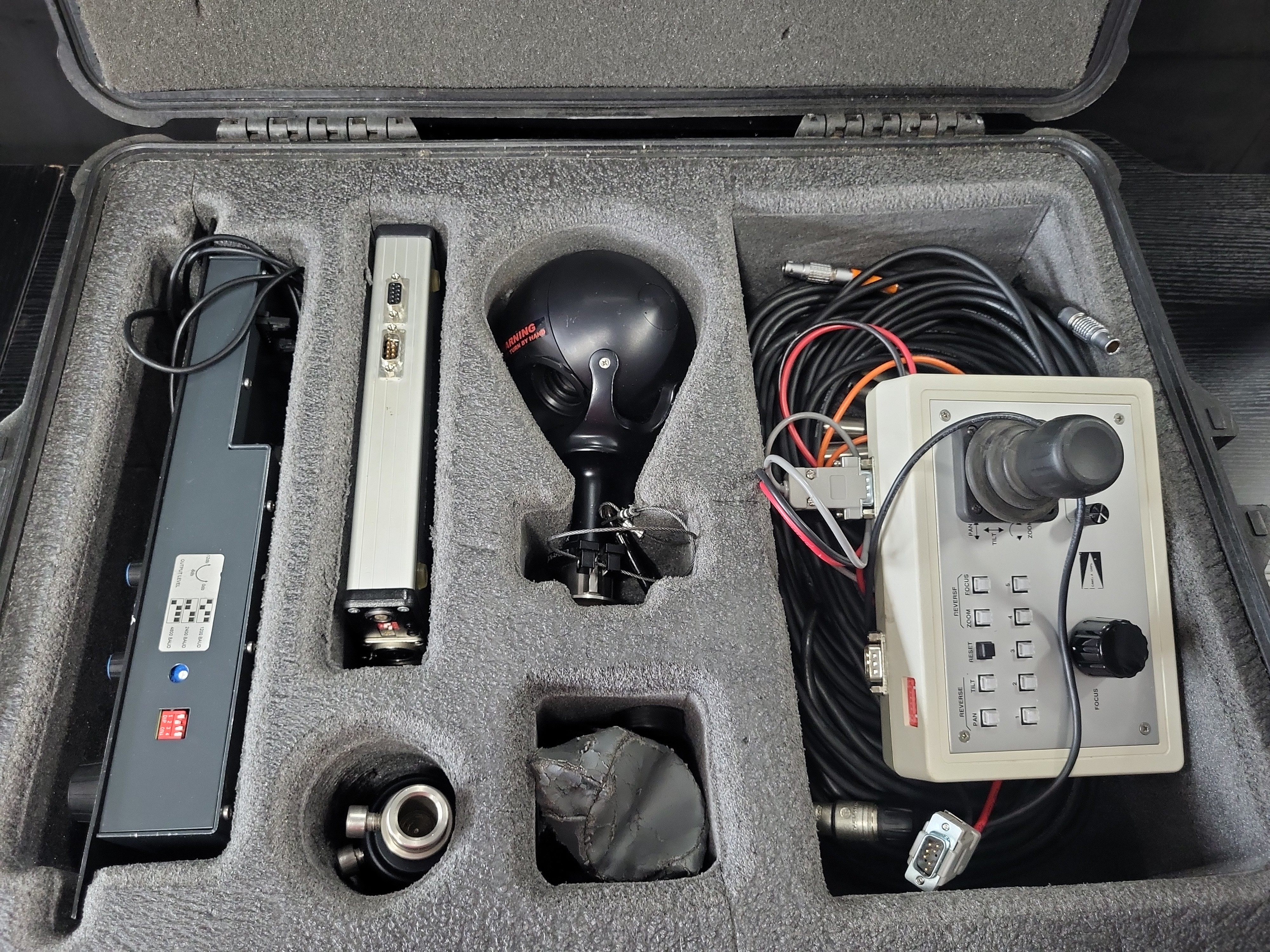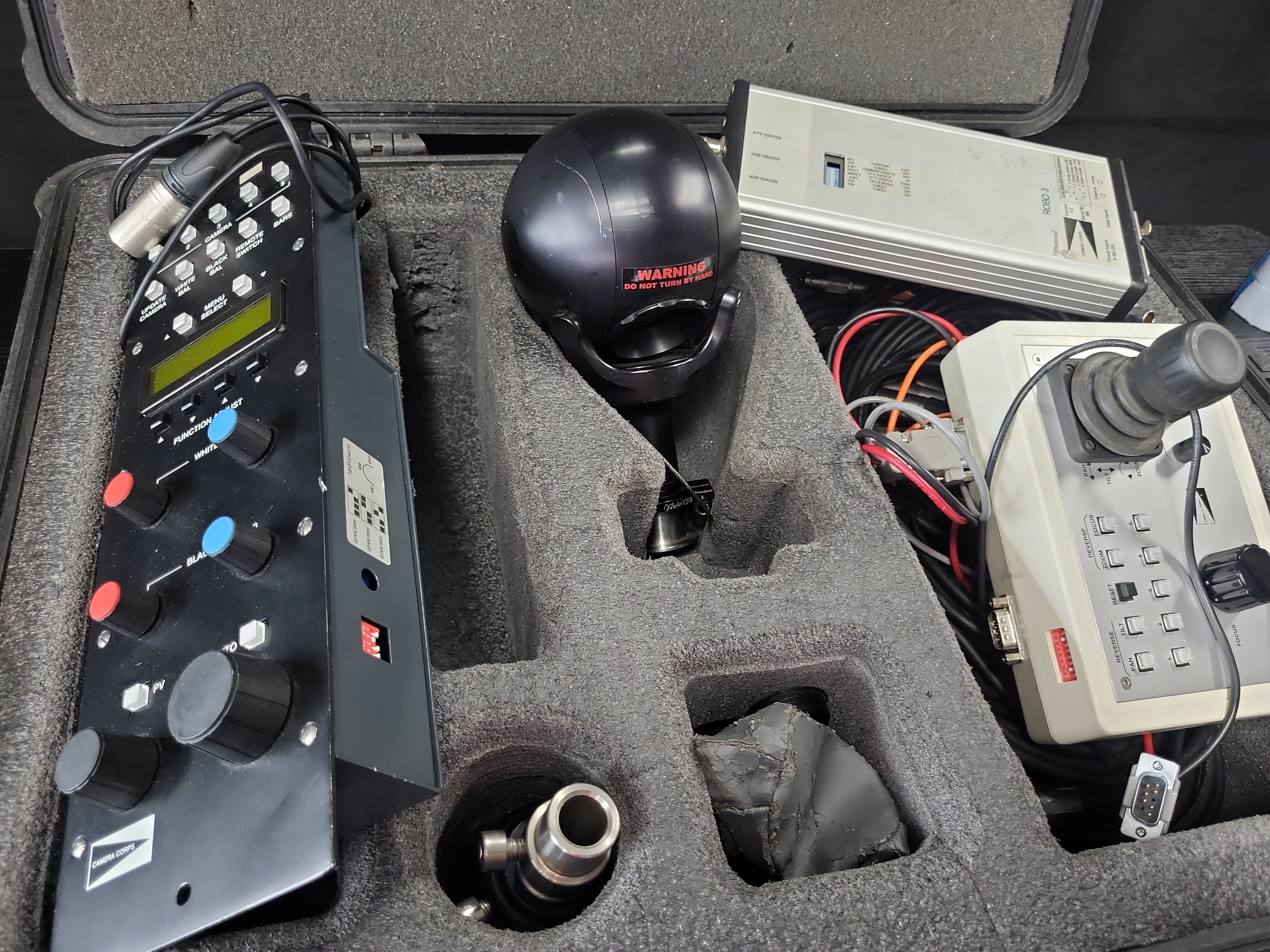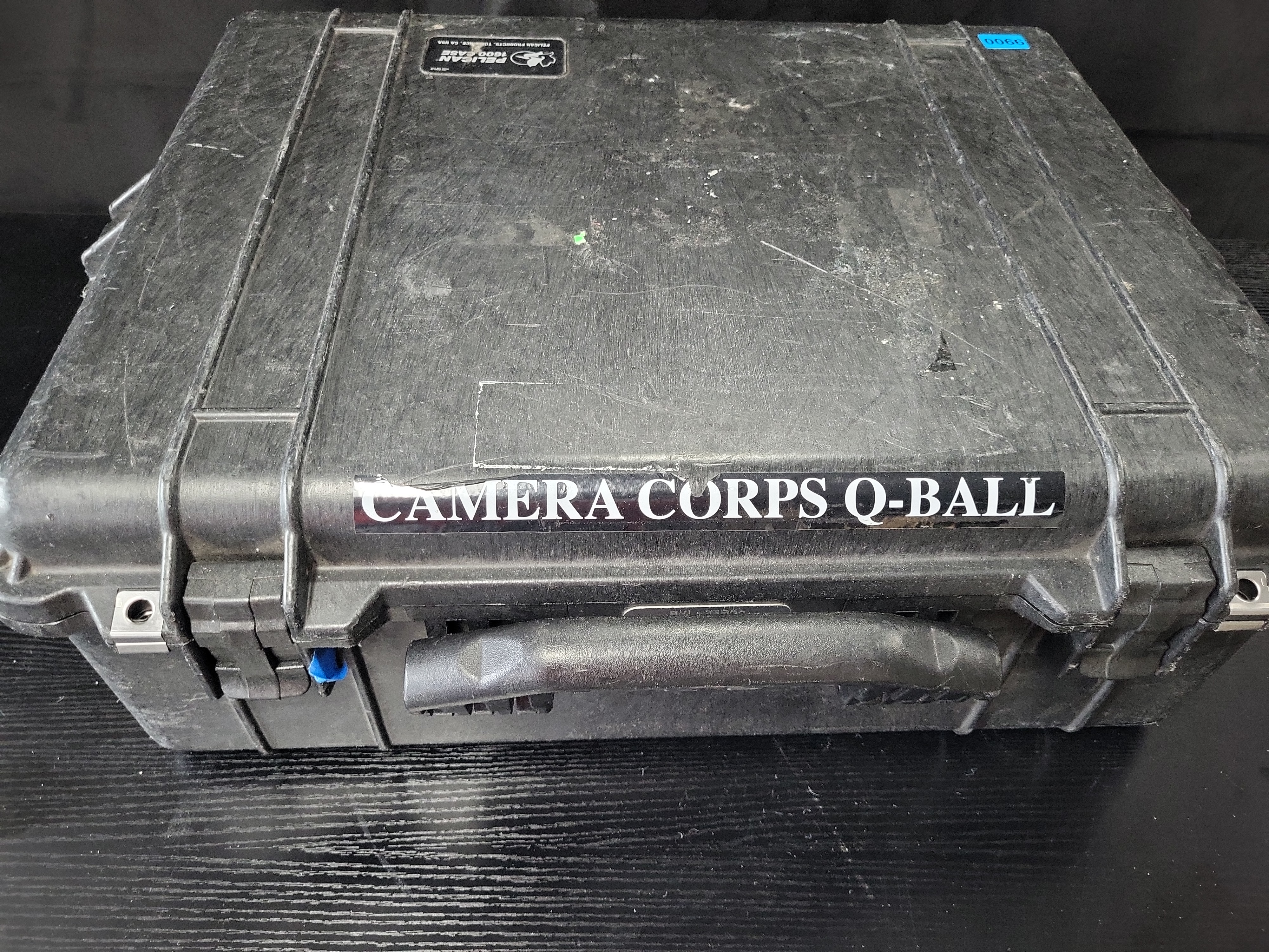 Manufacturer: Camera Corps. Model: Q-Ball. Serial Number: Not visible. Caliber: N/A. Action: Remote Pan/Tilt/Zoom. Barrel Length: N/A (Integrated Zoom Lens). Stock: Pelican 1600 Case. Proof Marks: Robo 3 Interface, Vitec Group branding. Production Date: Unknown. This professional broadcast kit includes a Q-Ball spherical PTZ camera head featuring a warning label reading Warning Do Not Turn By Hand, a Camera Corps Remote Control Panel (RCP) with LCD interface and adjustment knobs for white balance and black level, a manual joystick controller, and a Robo 3 interface and power distribution unit. The system includes assorted data and power cables with XLR and D-Sub connectors and a mounting bracket. All applicable laws apply to purchase and transfer.