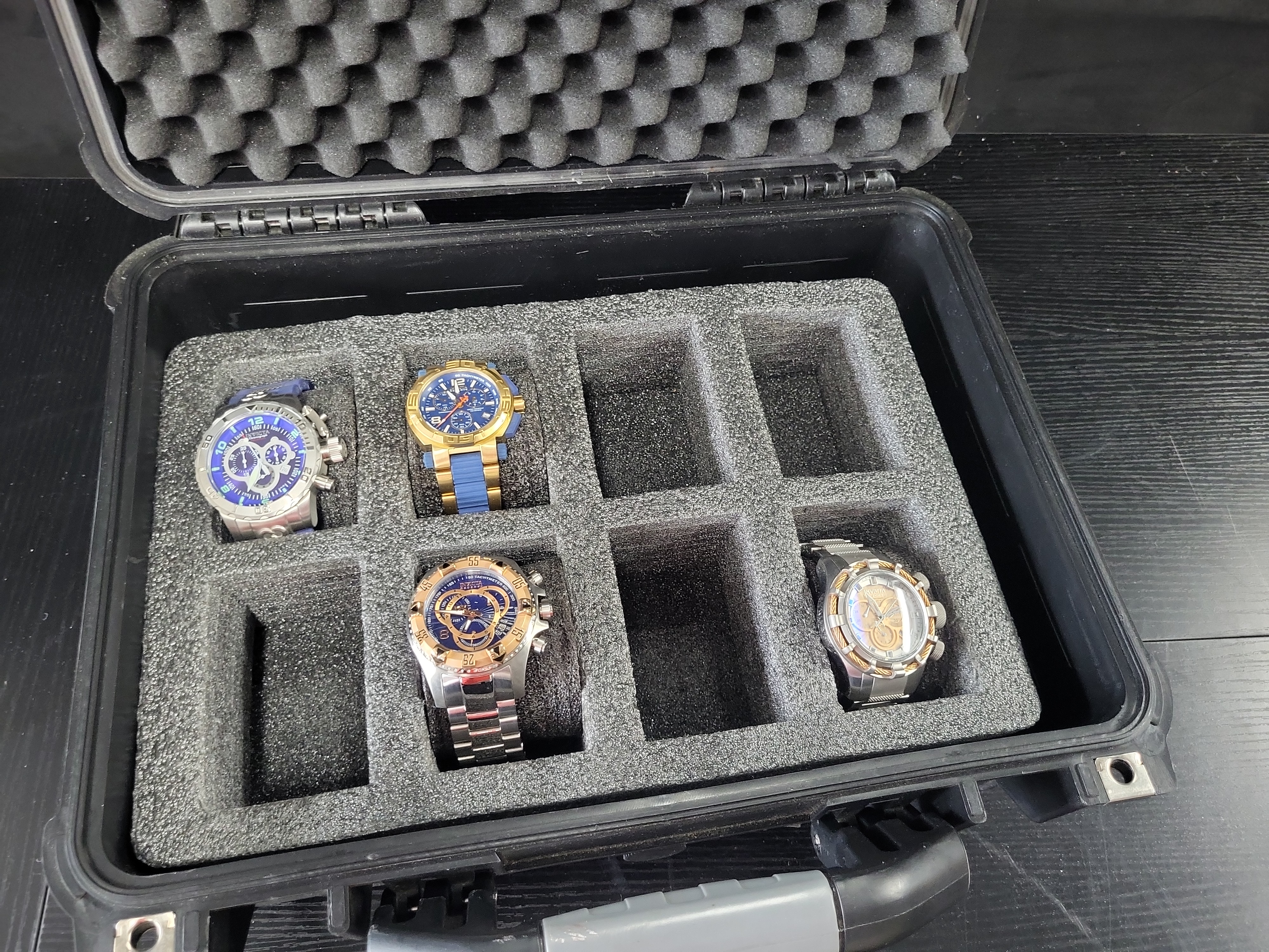 Bore Condition: Crystals and dials appear clear and free of significant scratches or chips. Finish Percentage: 90 percent; minor surface wear and scuffing on watch cases and bracelets. Stock Condition: Straps and bracelets are in good condition; some pieces retain factory protective plastic. Mechanical Function: Untested; batteries likely require replacement. Modifications: Items are housed in an aftermarket Apache brand hard-shell protective case with custom foam.