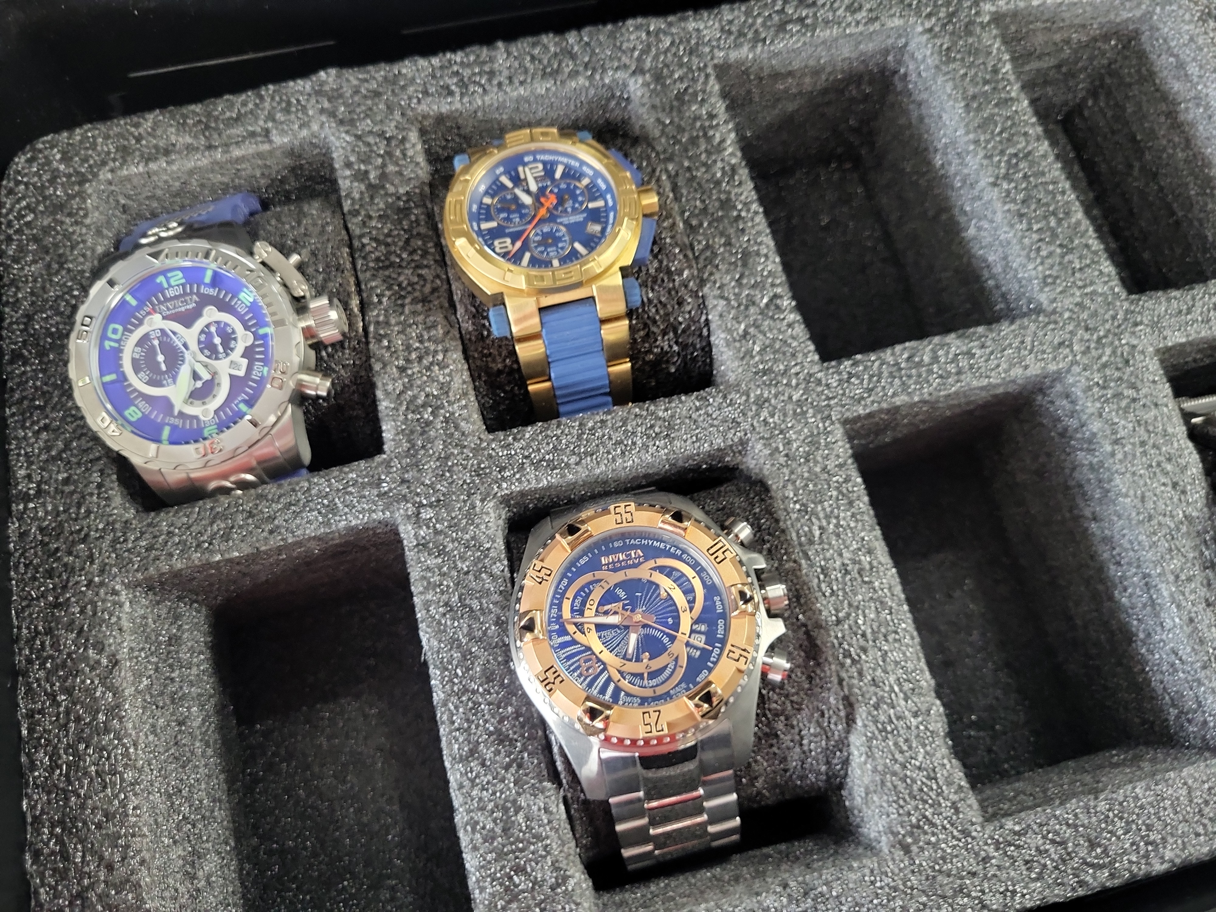 Manufacturer: Invicta; Apache. Model: Reserve Chronograph; 5800 Weatherproof Case. Serial Number: Not visible. Caliber: Quartz movement. Action: Analog chronograph with date complications. Barrel Length: Not applicable. Stock: Stainless steel, rose gold-tone plating, and blue silicone. Proof Marks: Water resistance markings on case backs. Production Date: 21st century.