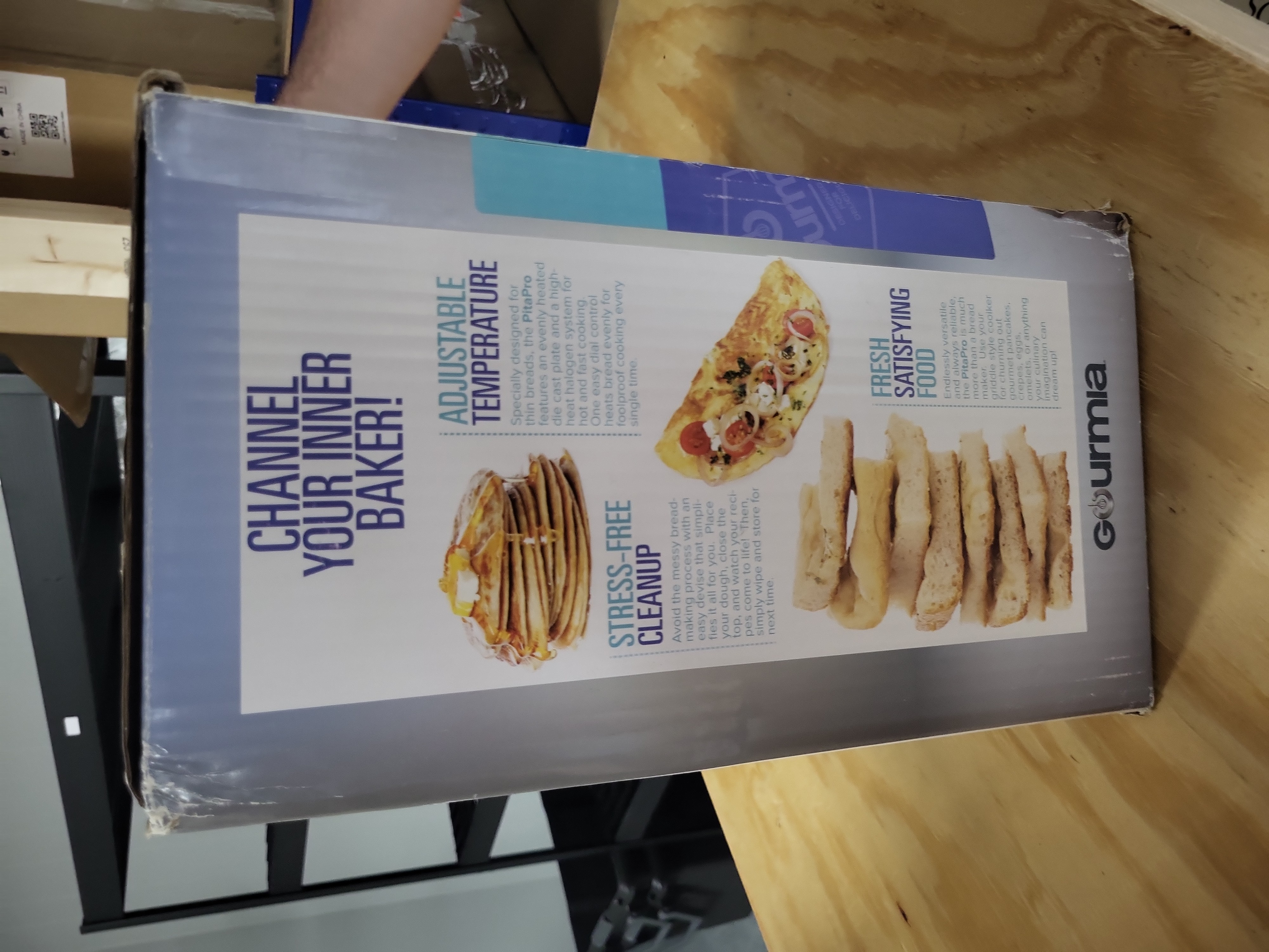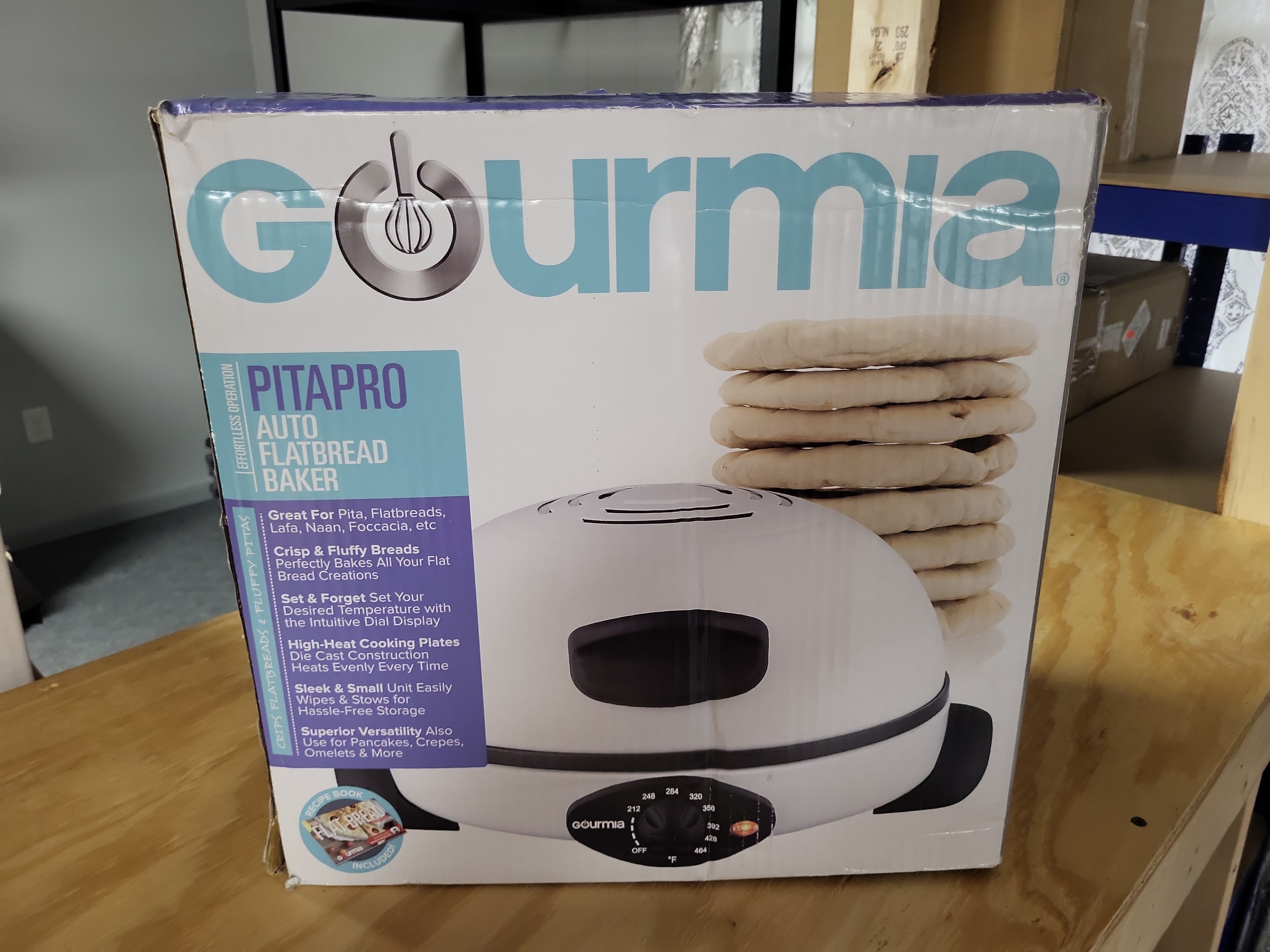 Manufacturer: Gourmia. Model: PitaPro. This electric countertop appliance is designed for preparing a variety of flatbreads including pita, naan, and focaccia, as well as pancakes, crepes, and omelets. It features a high-heat cooking system utilizing die-cast cooking plates and a halogen heating element for even heat distribution. The unit includes a front-mounted adjustable temperature control dial with a range of 212°F to 464°F. Designed for easy maintenance, the cooking surfaces are intended to be wiped clean. A flatbread recipe book is included with the unit.