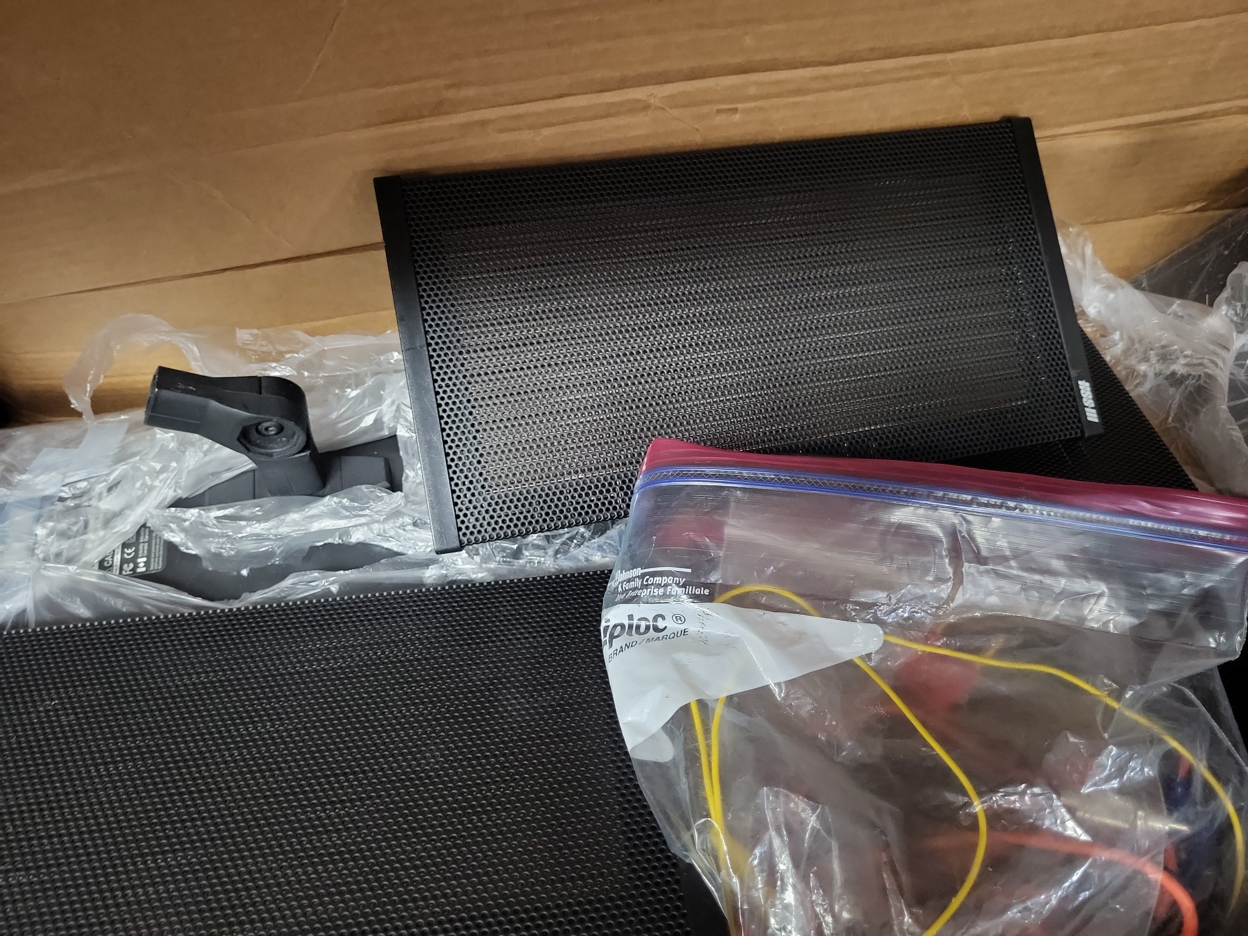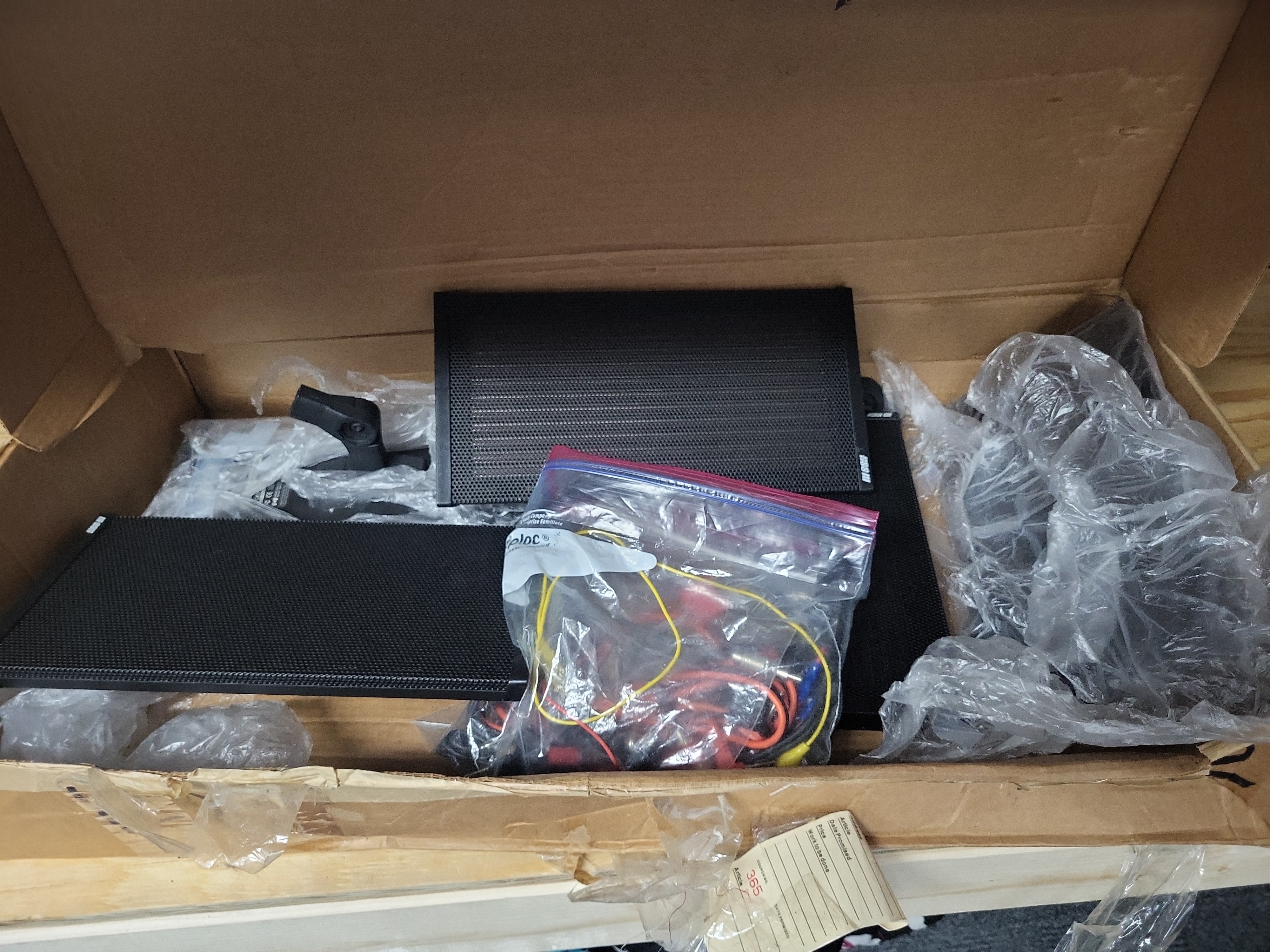 This lot contains components for a Bose portable column speaker system, featuring the brand’s signature perforated black metal grilles. The assembly includes two speaker column extensions, a base power unit partially wrapped in plastic, and a black plastic mounting bracket. Additionally, the lot includes a clear plastic bag containing an assortment of colored electrical test leads and connectors in red, yellow, and blue. The items are housed in a heavily distressed cardboard shipping box. Specific model and serial numbers are not clearly visible on the primary components.