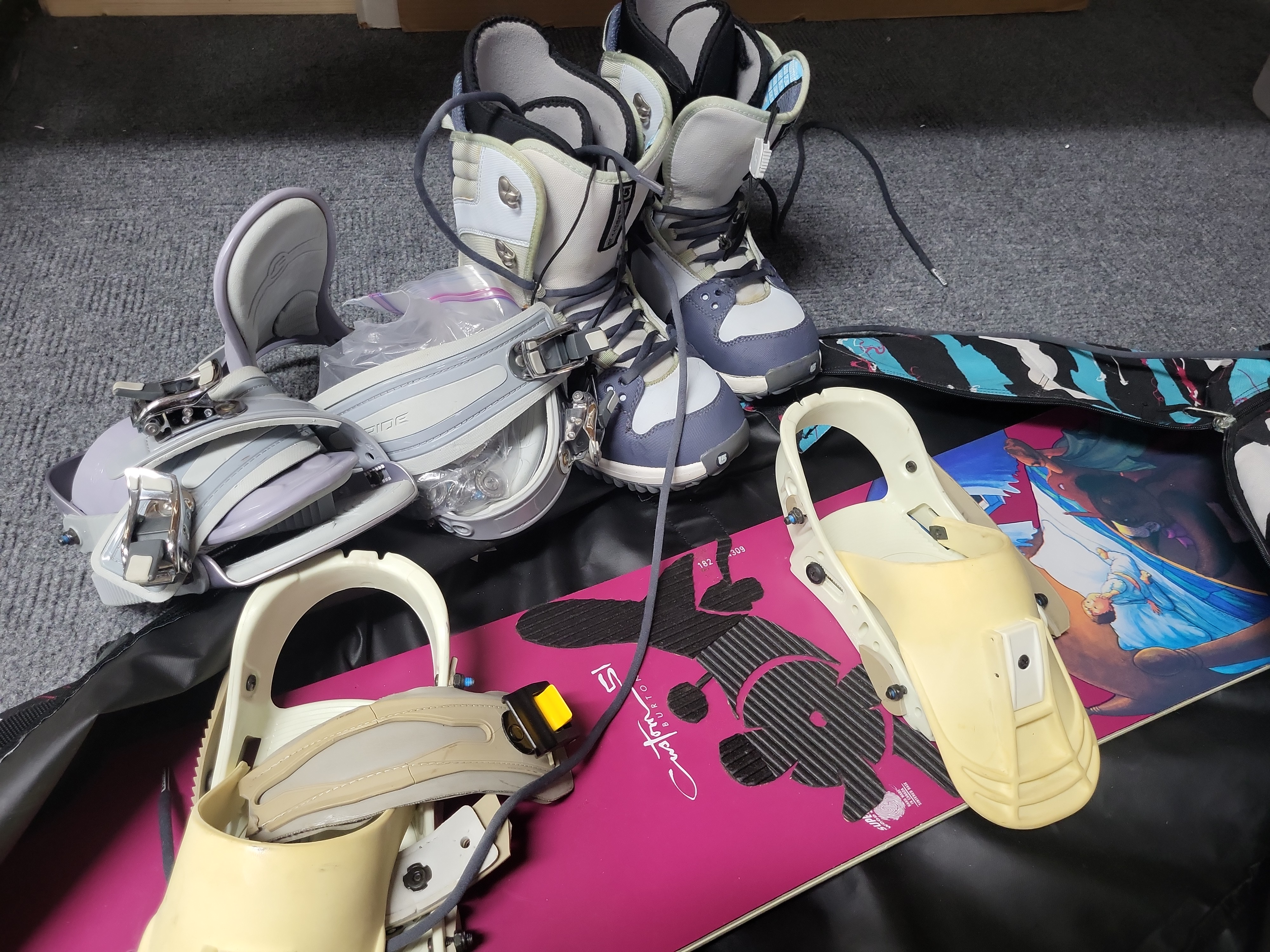 All items exhibit signs of previous use and moderate wear consistent with age. The snowboard top sheet shows typical surface scratches and edge wear. The Burton Freestyle boots show external scuffing and wear to the soles. The Ride bindings appear intact with standard cosmetic wear to the straps. The vintage Burton bindings show significant yellowing and UV-related discoloration to the white plastic components, which is common for composite materials of this era. The padded bag remains structurally sound with functional zippers, showing minor exterior soiling and scuffs. A small bag of mounting hardware is included, though the exact count of screws and washers is unverified.